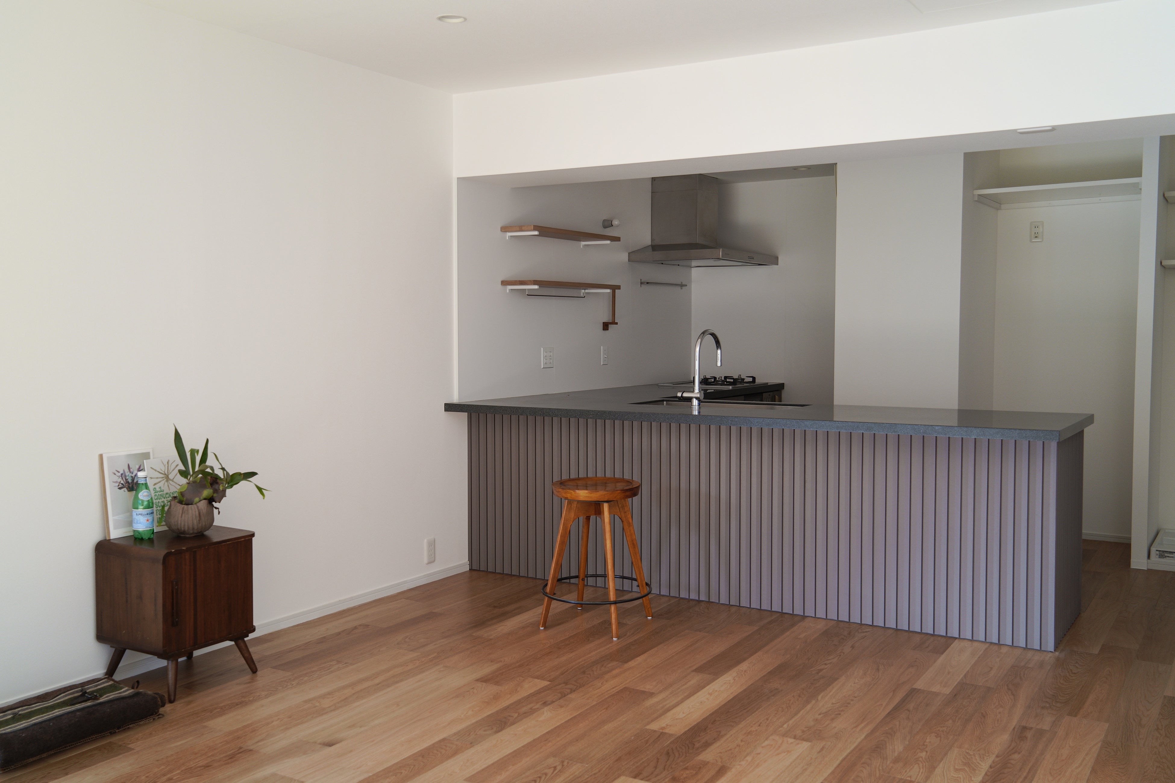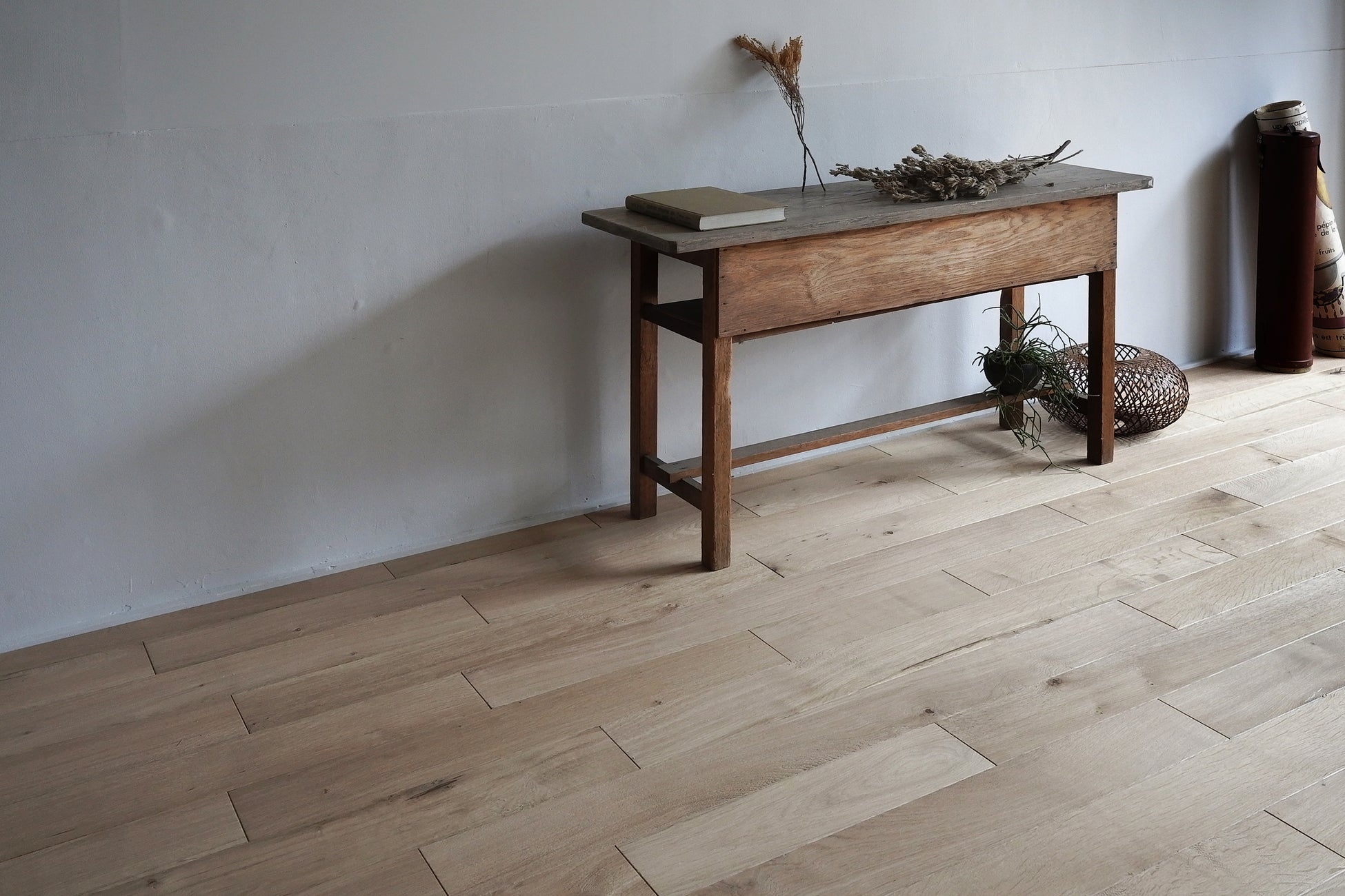 無塗装のままの表情を生かしつつ、汚れから表面を保護するために、使うオイルにこだわって仕上げたフローリングです。置くものを引き立てる、静かな世界観が似合います。