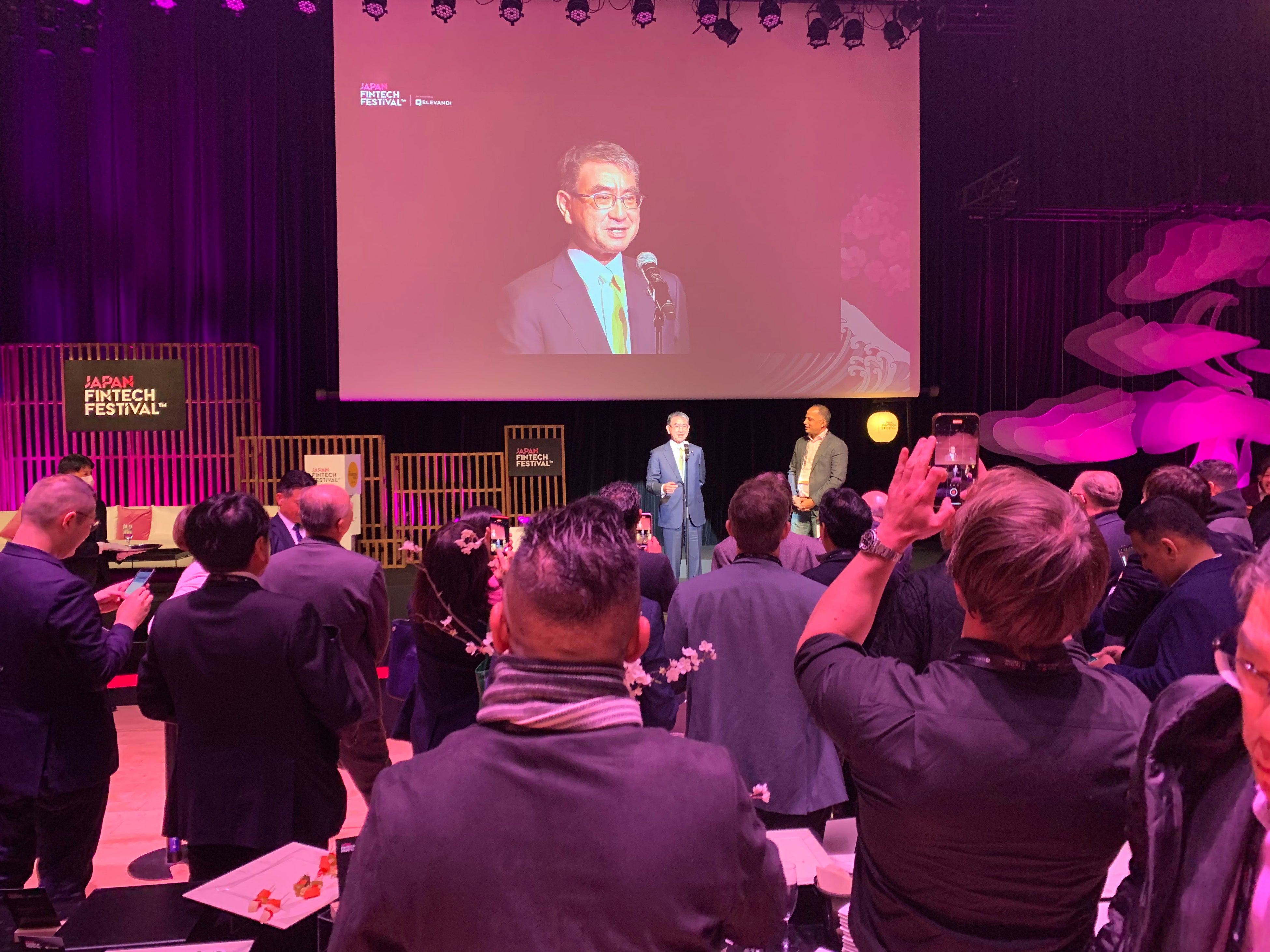 国会の審議で遅れて到着した河野太郎デジタル大臣は、神田明神で開催されたフィンテックイベントについて、「フィンテックと神社には長い歴史がある」と地元の銭洗弁天のご利益について、「それがフィンテックの古いスタイル」に例えて説明。「今日では、ビットコインやスマートフォンをどうやって"洗浄"できるのかわかりませんが」と話し笑いを誘いました。また、「海外でできることが日本でできないと、日本で銀行口座が開けないと大使たちから文句を言われます」と日本の金融システムは非常に"ユニーク"と話し、「日本も、キャッシュレスシステムで進んでいるインドやシンガポールに、追いつくように構築していきたい。『日本』だから時間はかかるが一度決めたことはやり遂げますので、少しお時間をください」と伝えると会場から拍手が湧き上がりました。