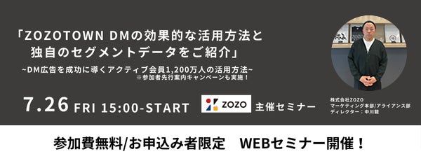 株式会社ZOZOがセミナー開催【7月26日(金)開催《お申込み者様限定》無料セミナー】「ZOZOTOWN DMの効果的な活用方法と独自のセグメントデータのご紹介」【株式会社ディーエムエスが一次代理店】