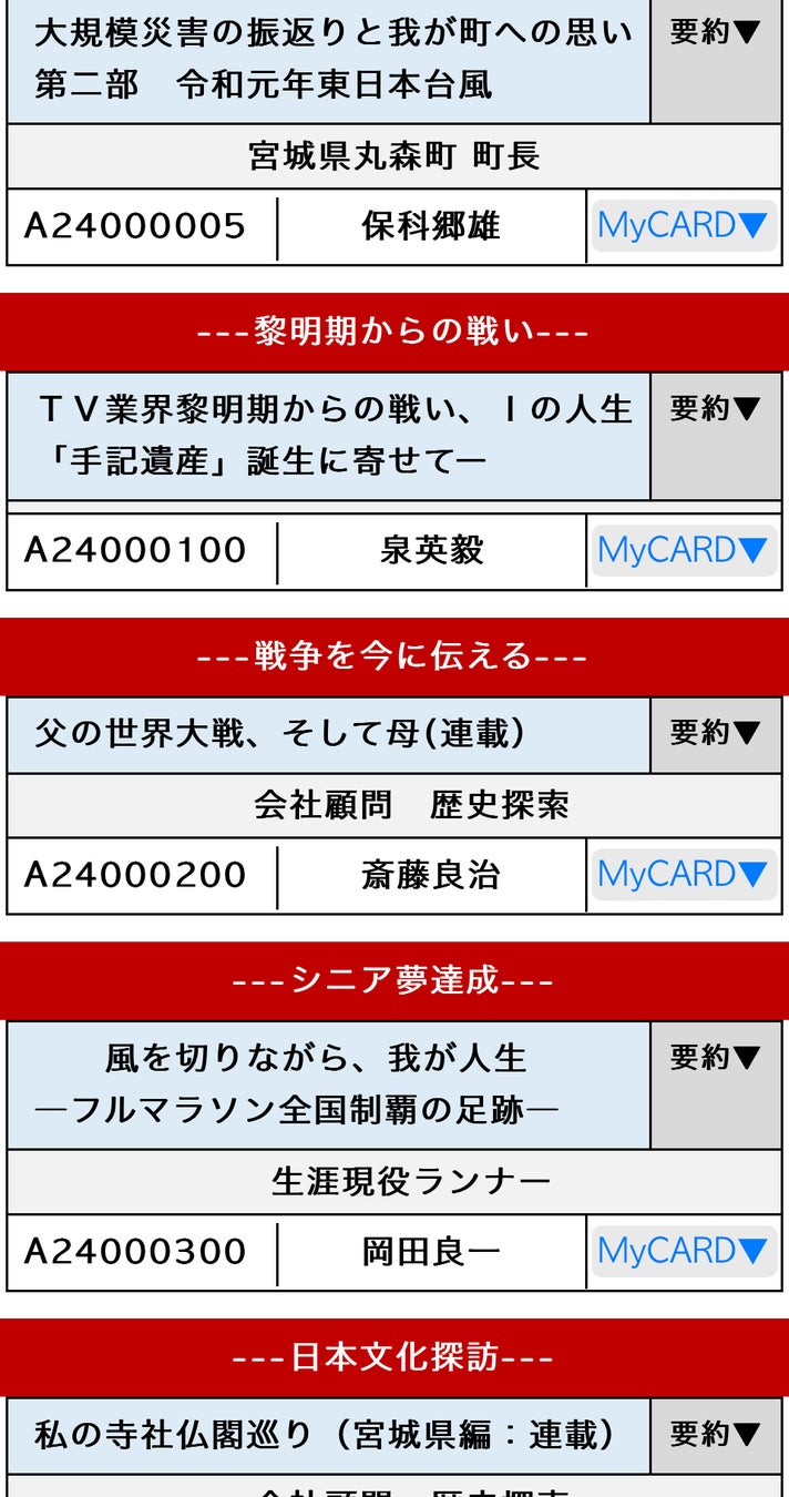 現在、手記遺産には人生回想録としての一般手記に加え、震災時に陣頭指揮をとられた市長、町長等が綴る「東日本大震災を繋ぐ」、戦後80年でそれを知る最後の世代の生の声「戦争を今に伝える」、昭和世代が戦後復興や高度成長で興した新しい産業/事業の戦いを振り返る「黎明期からの戦い」、シニア世代の元気を応援する「シニア夢達成」、日本の文化や遺跡を訪ねその思いをつづる「日本文化探訪」、家族の歴史を書き留め紹介しつつ子々孫々に伝える「家族を繋ぐ」、人口減が激しく消滅の危機にある地方のための「地域を生き繋ぐ」など多様なジャンルが設定されています。