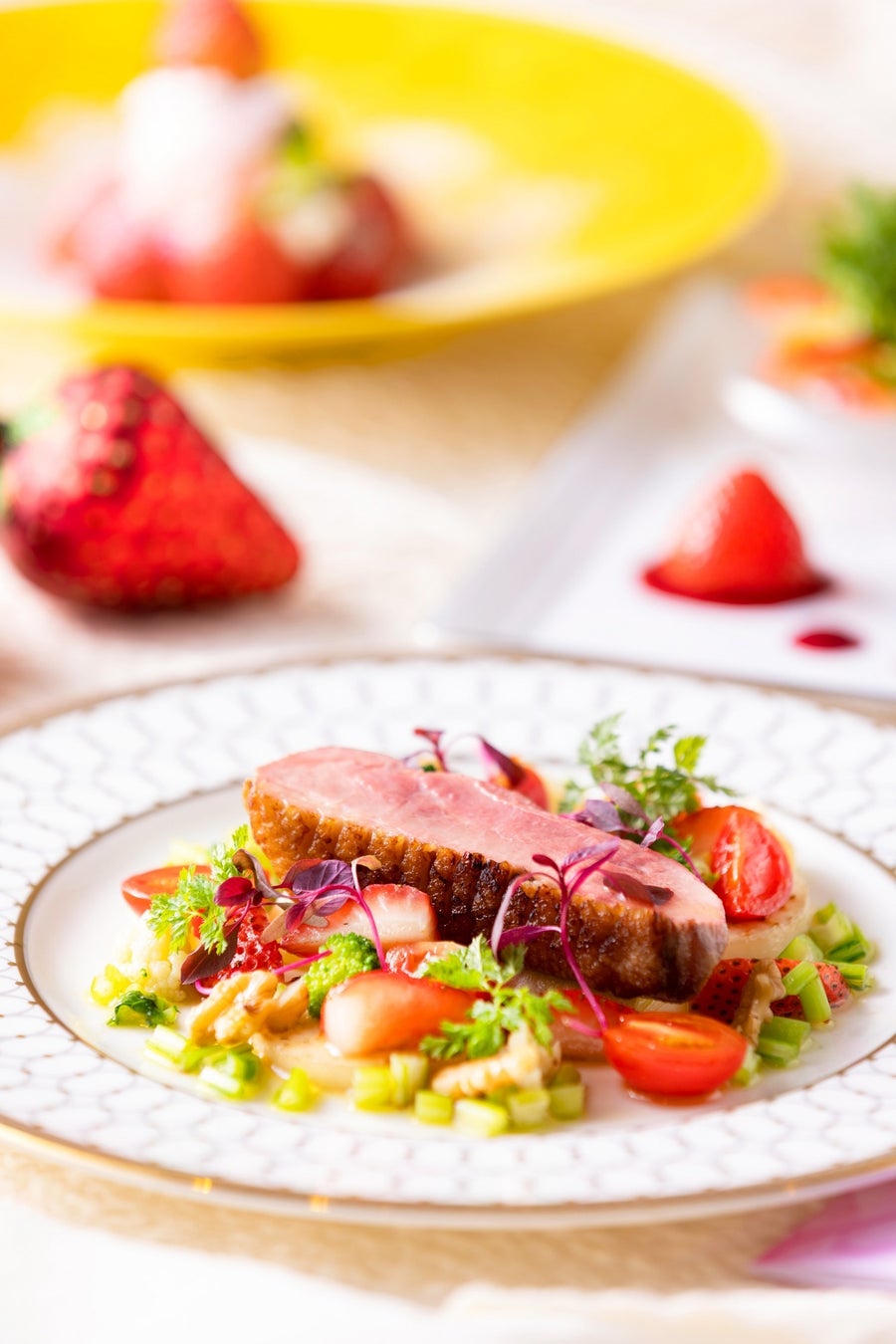 「帆立と苺のジュレ寄せ」「苺の冷製スープ」「苺のサラダ シャンパーニュドレッシング」から始まり、メイン料理は「鴨のロースト あまおうを