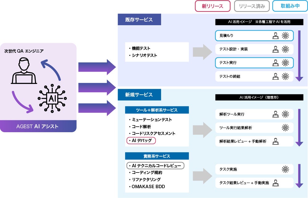 AIデバッグサービスは、「AGEST AIアシスト」の一環として、今年2月にリリースした、次世代QAエンジニアがAIを活用しソースコードをレビューする「AIテクニカルコードレビュー」に続く、第2弾のAIサービスになります。