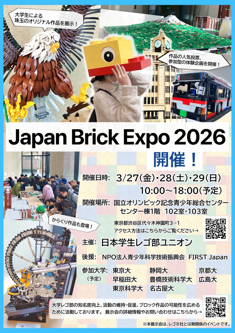 日本学生レゴ部ユニオン(静岡大学レゴ部 部長:佐藤隆貴)はJapan Brick Expo 2026を東京都渋谷区「国立オリンピック記念青少年総合センター棟102室・103室」にて2026年3月27日(金)~29日(日)に開催します。このイベントは、一ブロックを通じて人と企業が集まる事を目的に、全国の大学レゴ部および企業関係者、一般来場者を対象にしたものです。