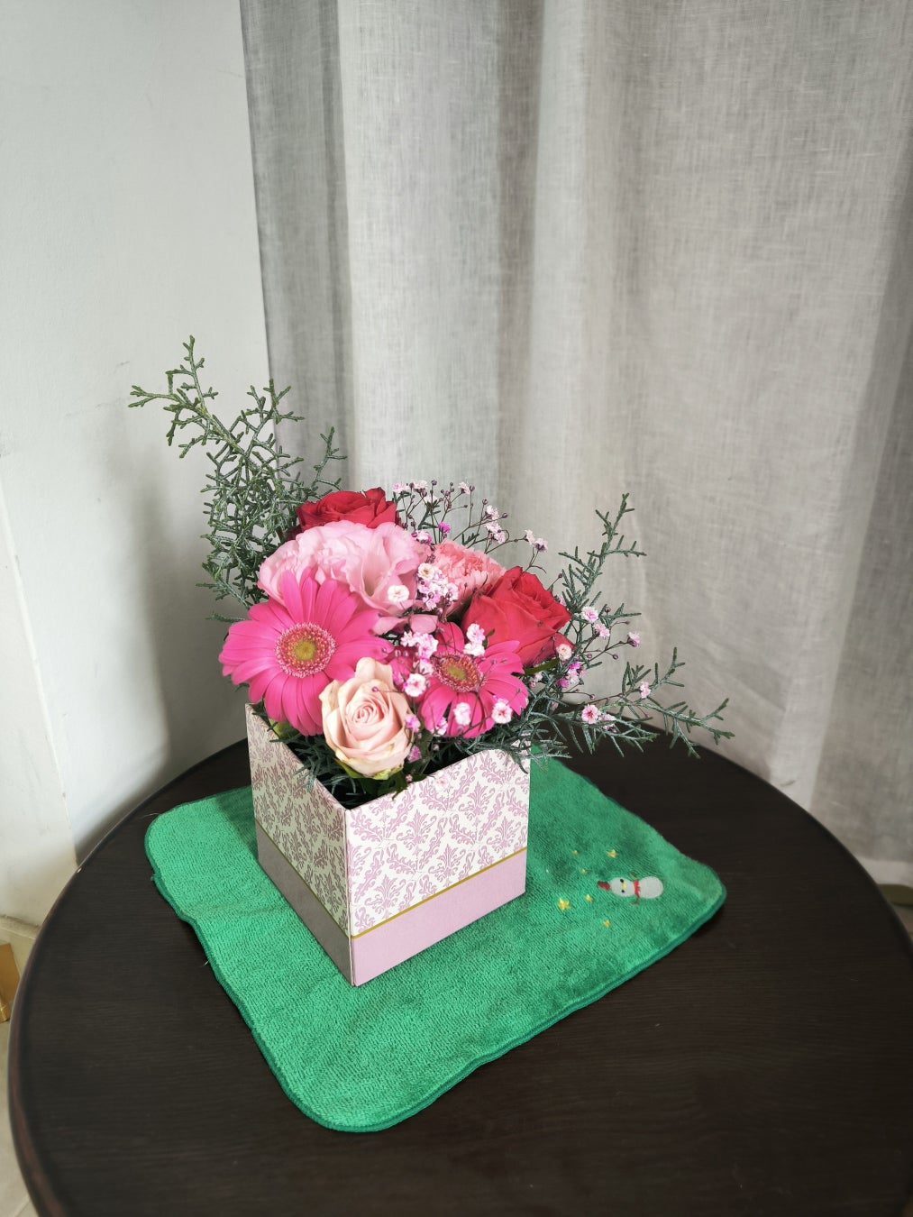 4口だけだったのですが、綺麗なアレンジメントが届き、当日も飾ってくださっていました。日頃からたいへんお世話になっているので、こういう形でメッセージで伝えることができて良かったです!