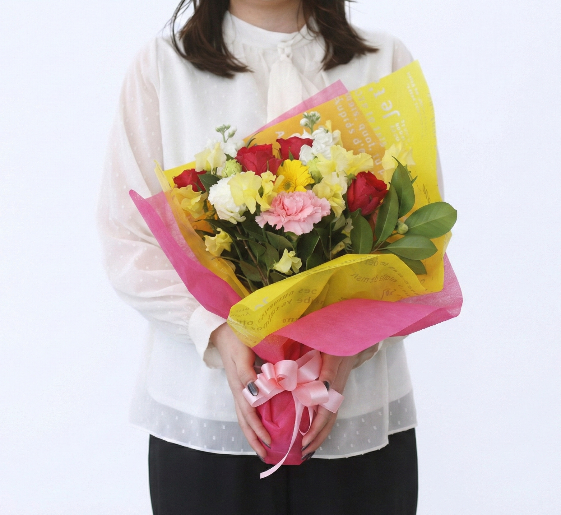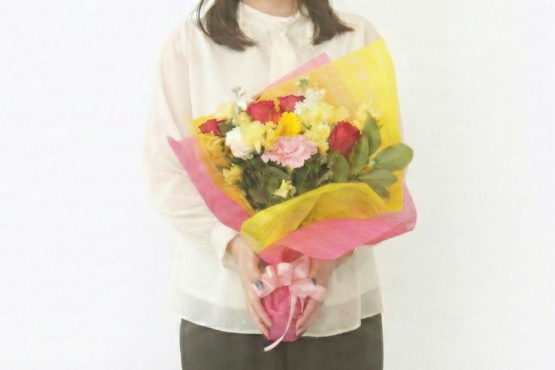 花束は作り置きなし。提携フラワーショップが配送直前に新鮮な花材で作成し、梱包箱でお届けします。