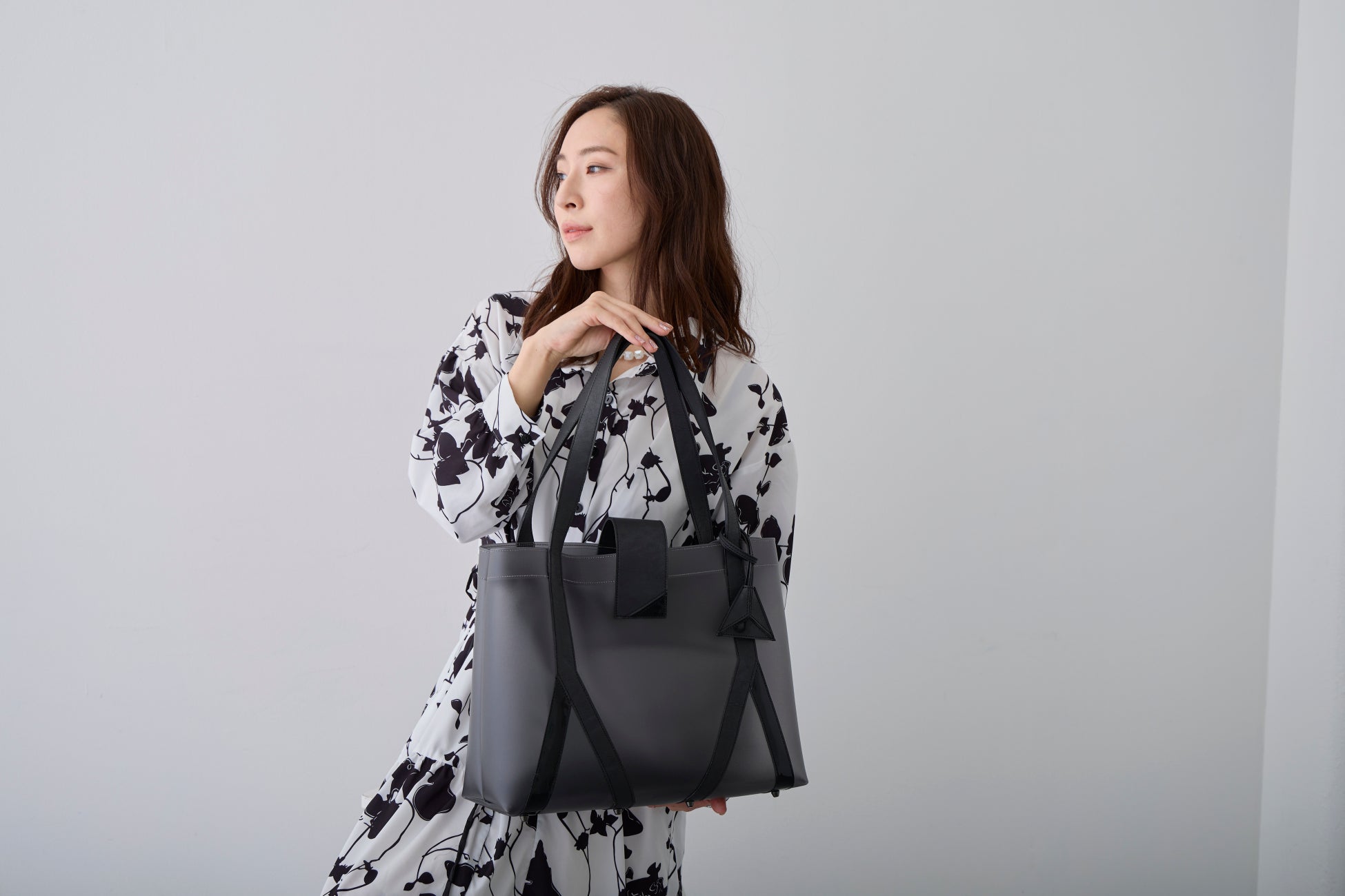 TOMOMI YOKOYAMA DESIGNと初コラボ。都市建築へのオマージュのような幾何学的デザインを異素材レザーを表面にテーピングさせることで実現しました。バイカラーのレザーの片方にエナメル素材を使用。 PVC地とのアーティスティックなコントラストと、春夏の光が反射するような柔らかいニュアンスが生まれました。