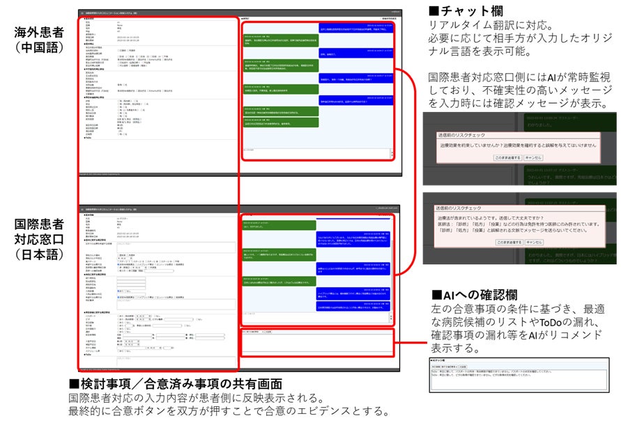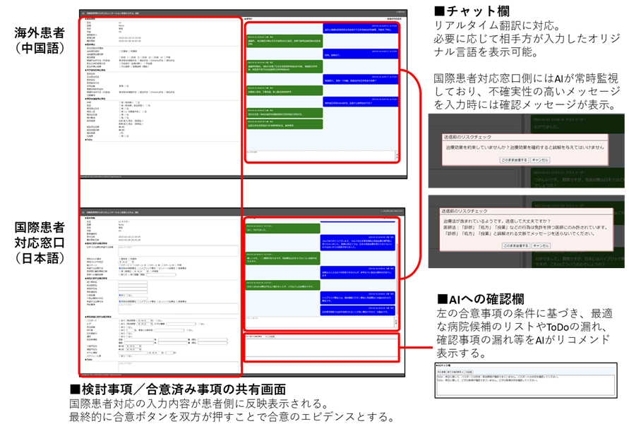 本システムは、国際患者対応従事者のノウハウを学習したAIを利用して、来日候補者とのコミュニケーションエラーや確認事項の漏れ、結果として満足度の低下につながる不確実性を回避するナッジ情報をシステム使用者に提供することを特色としており、国際間コミュニケーションを想定し多言語対応(現状では韓国語と中国語)の機能を備えている。