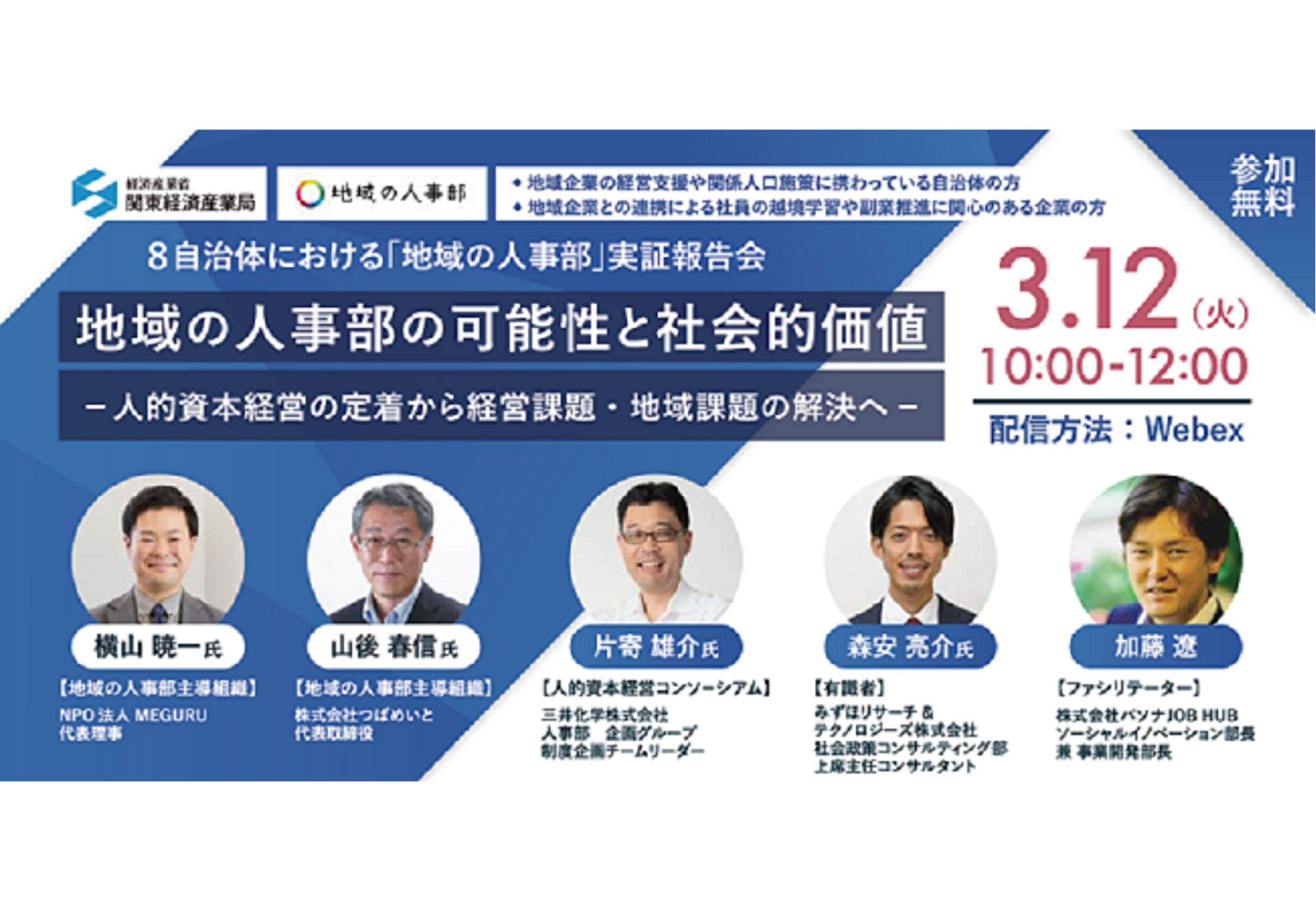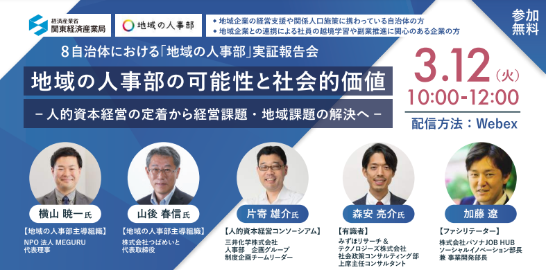 主な内容 | スケジュール予定 10時00分~10時05分 オープニング・開会挨拶 10時05分~10時25分 「地域の人事部」の取組概要について(関東経済産業局) 10時25分~10時45分 「地域の人事部」の取組事例について(株式会社パソナJOB HUB) 10時45分~11時45分 パネルディスカッション 11時45分~12時00分 クロージング(関東経済産業局) パネルディスカッション登壇者 株式会社つばめいと 代表取締役 山後春信氏 NPO法人MEGURU 代表理事 横山暁一氏 三井化学株式会社 人事部 企画グループ 制度企画チームリーダー 片寄雄介氏 みずほリサーチ&テクノロジーズ株式会社 社会政策コンサルティング部 主任コンサルタント 森安亮介氏 株式会社パソナJOB HUB ソーシャルイノベーション部長兼事業開発部長 加藤遼 関東経済産業局 地域経済部 社会・人材政策課長 石原優 |