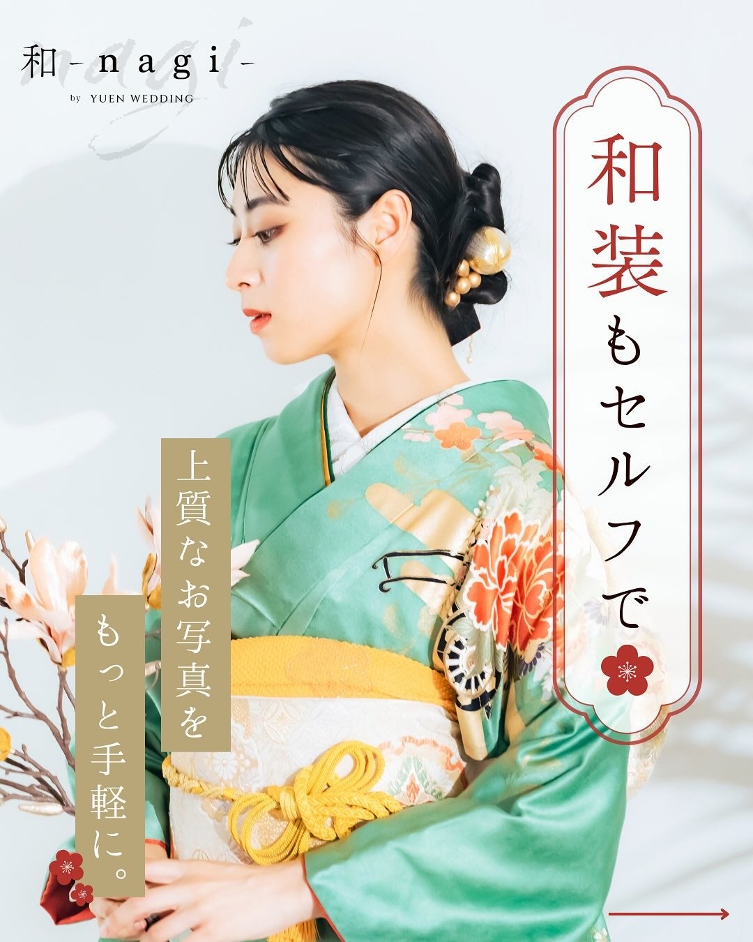 「和 -nagi-」は、和装フォトウェディングをもっと身近に、もっと気軽にお楽しみいただくために誕生した和装専門スタジオです。従来の和装撮影は高額で敷居が高いイメージがありましたが、nagiでは本格的な和装撮影を3万円台から実現。セルフフォトウェディングで培ったノウハウを活かし、リラックスした雰囲気の中で自然な笑顔を残していただけます。