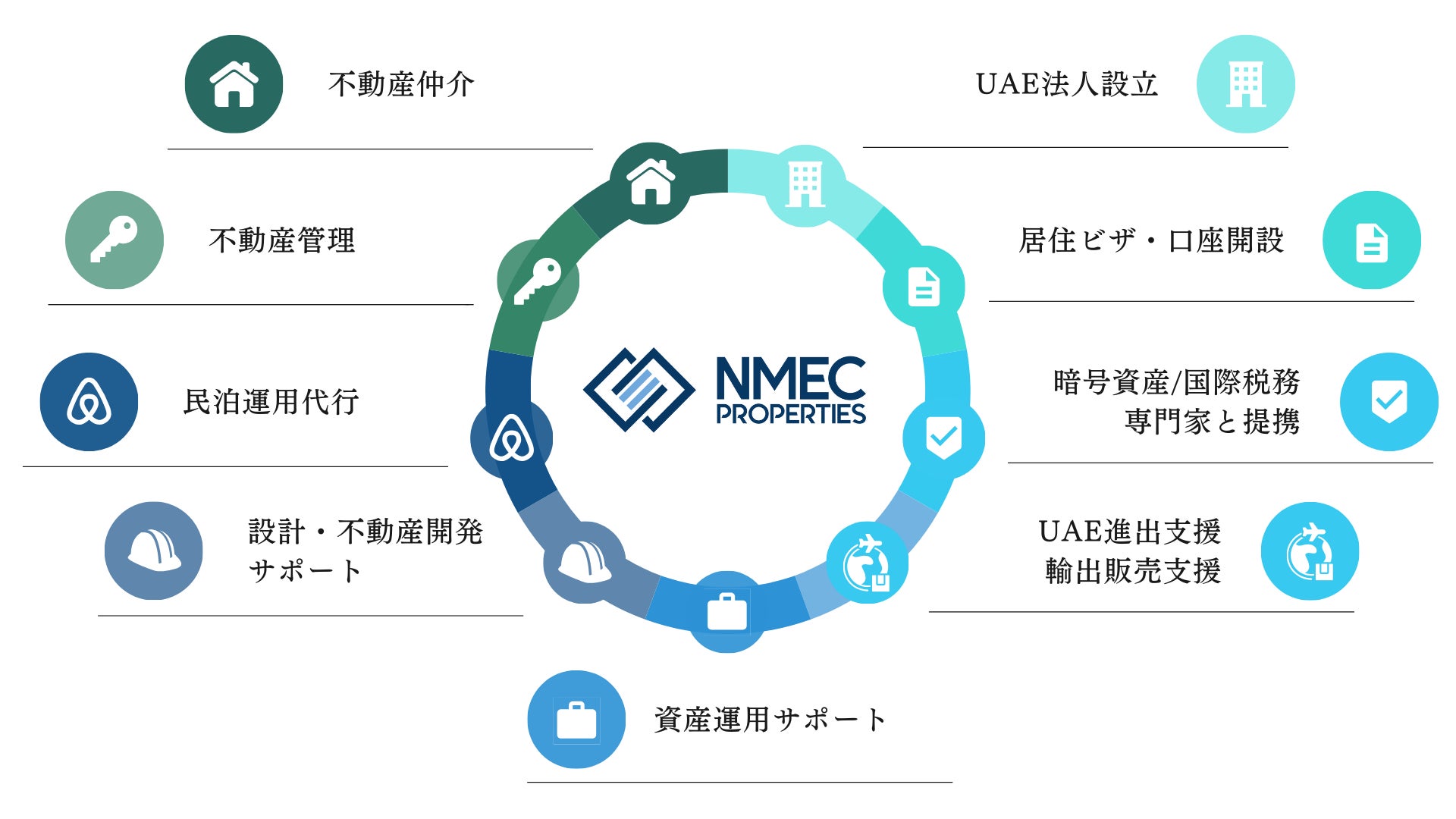 私たちNMECグループは、ドバイを拠点としてライセンスを保持する会社グループです。ドバイ不動産仲介、民泊運用の代行業、法人設立サポート、ビザ取得サポート、貿易など、ワンストップサービスを提供する専門企業です。