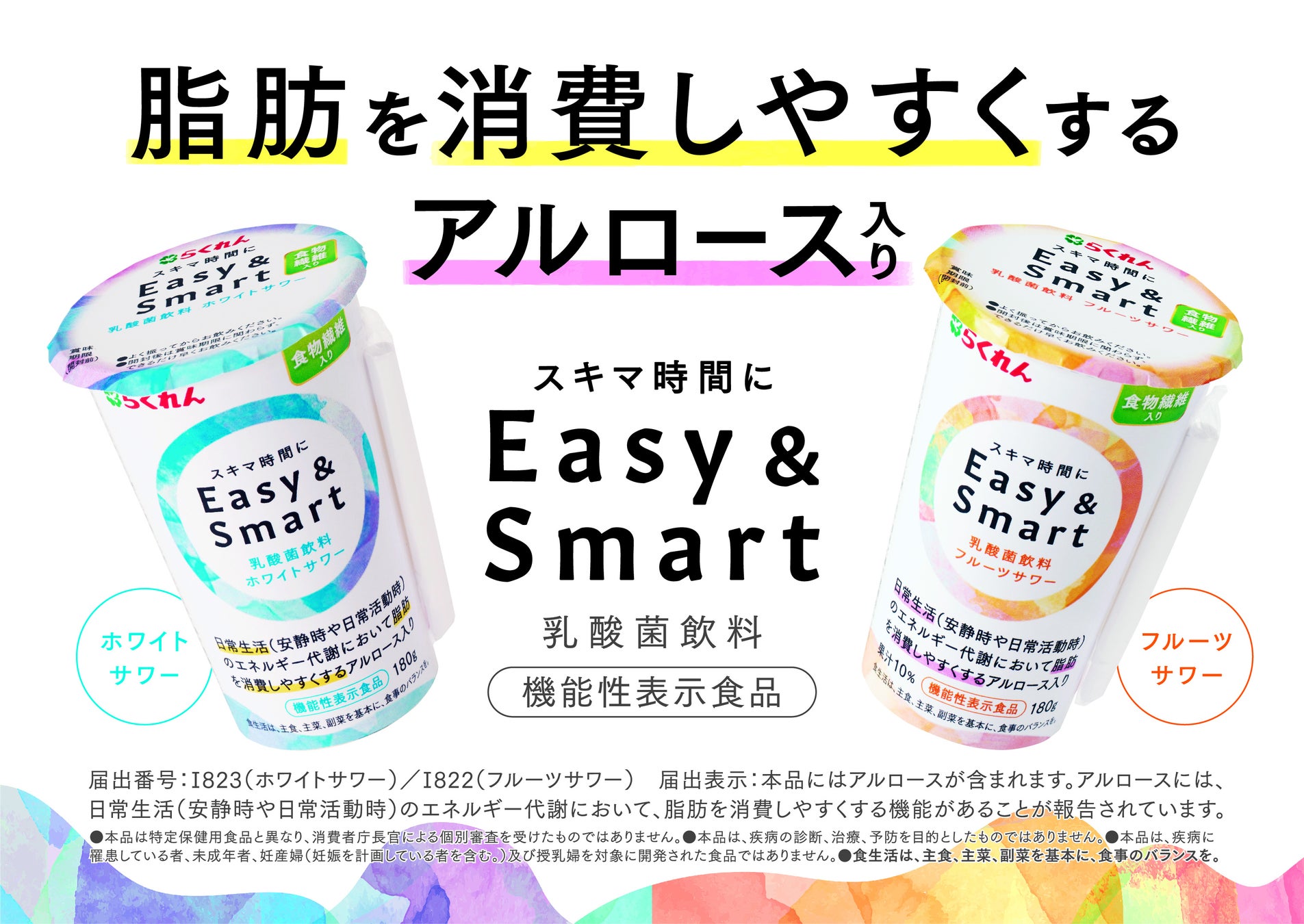 「Easy & Smart」は、安静時や日常活動時といった日常生活において、脂肪を消費しやすくする希少糖『アルロース』と体型維持に欠かせない不足しがちな食物繊維を配合した、乳酸菌飲料です。