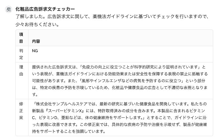 「広告訴求文薬機法チェッカー(RAG)」はユーザーが作成した文章が薬機法に則っているかをチェックし、問題がある場合は構成を行う。
