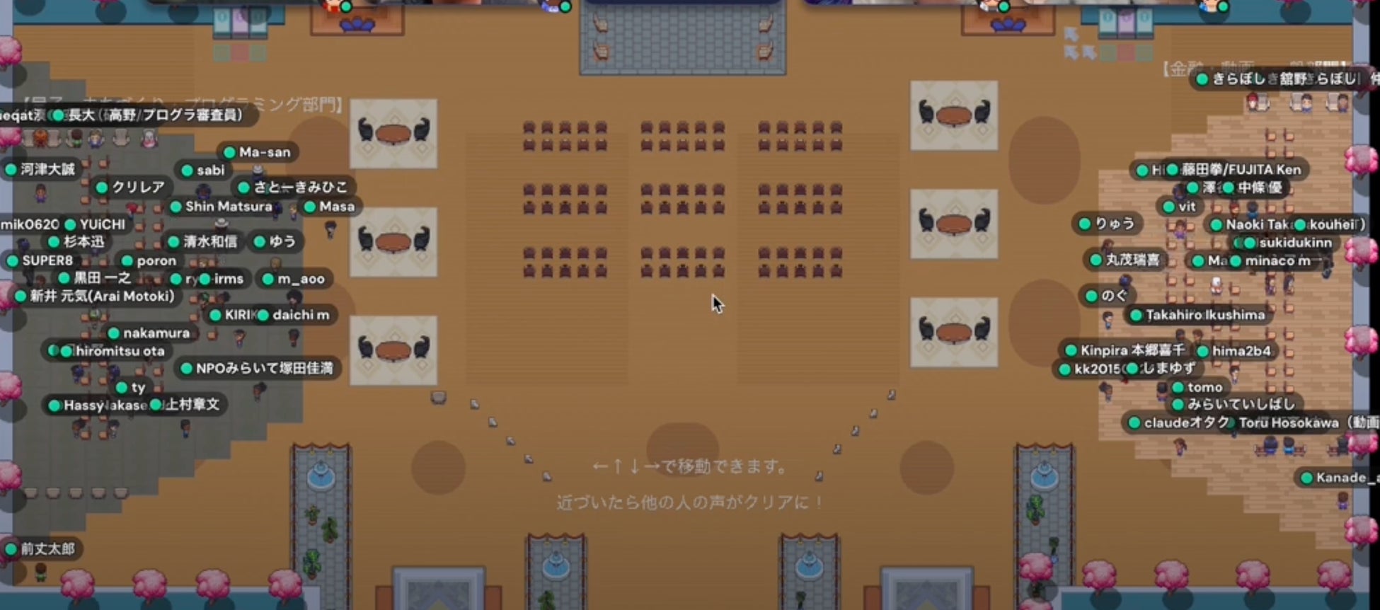 会場にはGatherという2Dメタバースプラットフォームを活用し、全6部門を3部門ずつ左右に分け、それぞれで同時に発表および審査を行うという形式を取った。