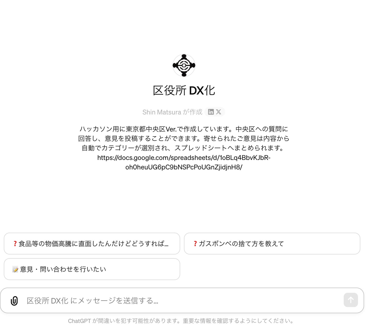 まちづくり・教育部門の優勝はShin Maturaさんが作成された区役所DX化アシスタントだ。