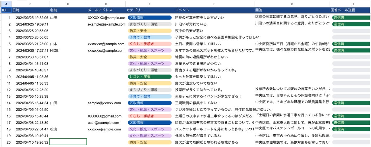 GPTsがスプレッドシート連携されており、問い合わせ内容が自動的にスプレッドシートへ記録されるだけでなく、カテゴリ分けも自動で行われる。