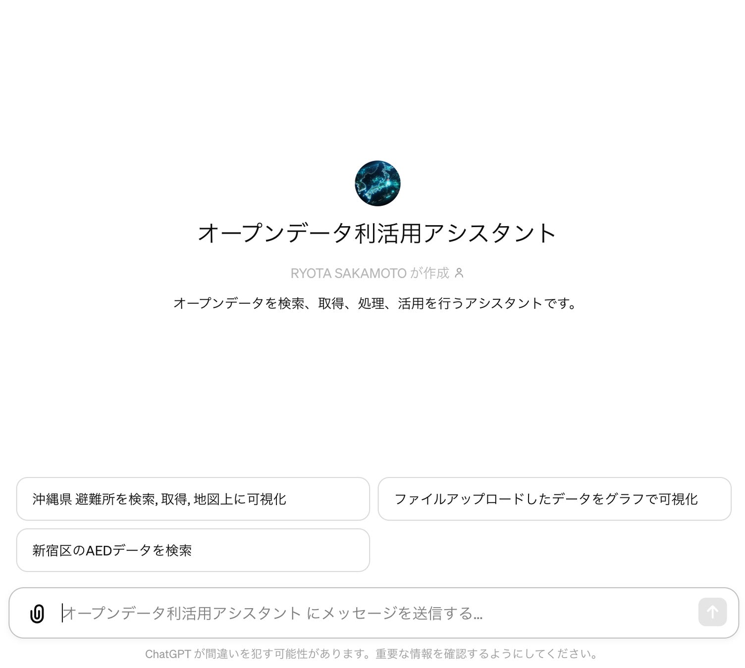 「オープンデータ利活用アシスタント」はデータカタログ横断検索システムとryo-maさん自作のプロキシサーバを組み合わせて、ユーザーの目的に合ったオープンデータを探索し、データ提供および、グラフ化などによる可視化を行うGPTsだ。