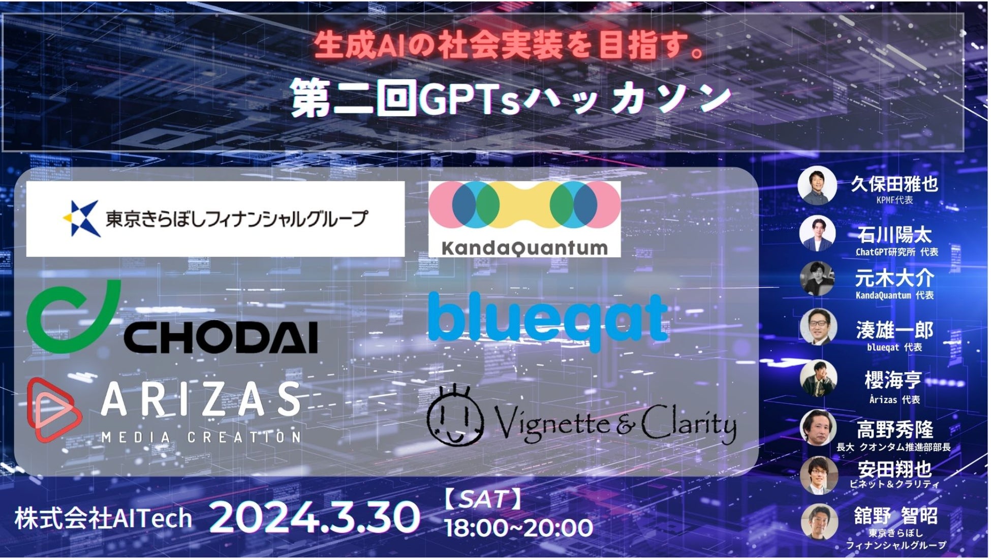 株式会社AITech(東京都渋谷区、代表取締役/CEO:河津大誠、以下 当社)は、2024年3月30日に開催したオンラインハッカソンイベント「第2回 Vertical AI Hackathon」のイベントレポートを公開したことをお知らせいたします。