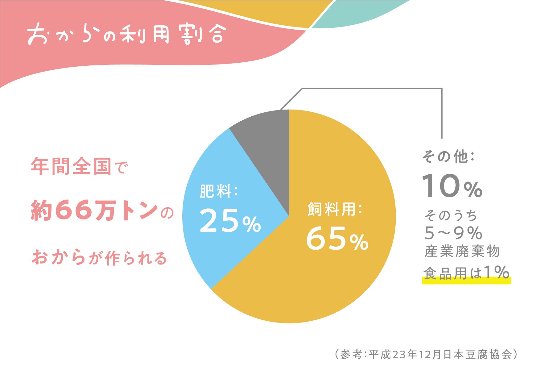 日本豆腐協会によると、全国で作られる66万トンのおからのうち、食用として再利用されているのはたった1%。残りの90%は、肥料や飼料、産業廃棄物となっています。