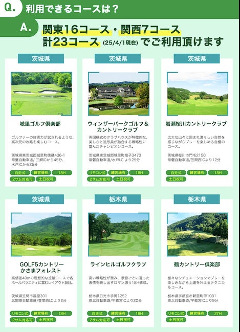 ◆ 提携ゴルフ場一覧 関東16コース、関西7コース、合計23コース(2025年4月1日現在)でTRINITY GOLFのサー ビスをご利用いただけます。提携エリア、コースは随時拡大してまいります。