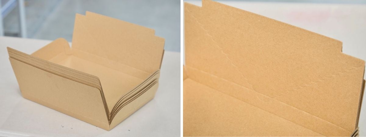 箱がななめに開いて成型後に重ねられるため保管スペースが最小化できる(左写真)。箱にミシン目が入っているので開封性も良い(右)