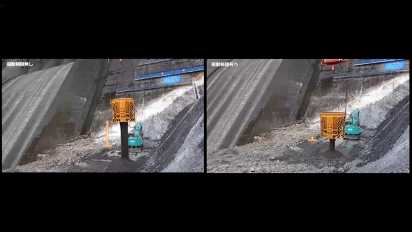 放出時における揺動抑制の比較(左:揺動抑制無し、右:揺動抑制有り)(動画再生時間:9秒、映像は砕石を使用)