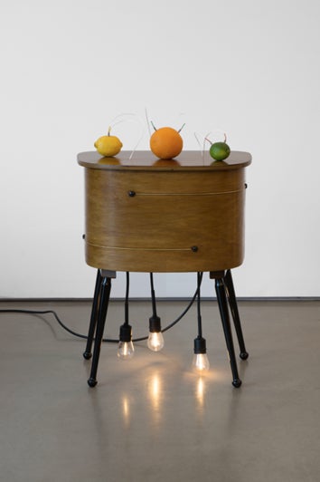 毛利悠子 / Yuko Mohri 「Decomposition Europa modernist sewing box, 3 LED lights illuminated by fruits」 2024年