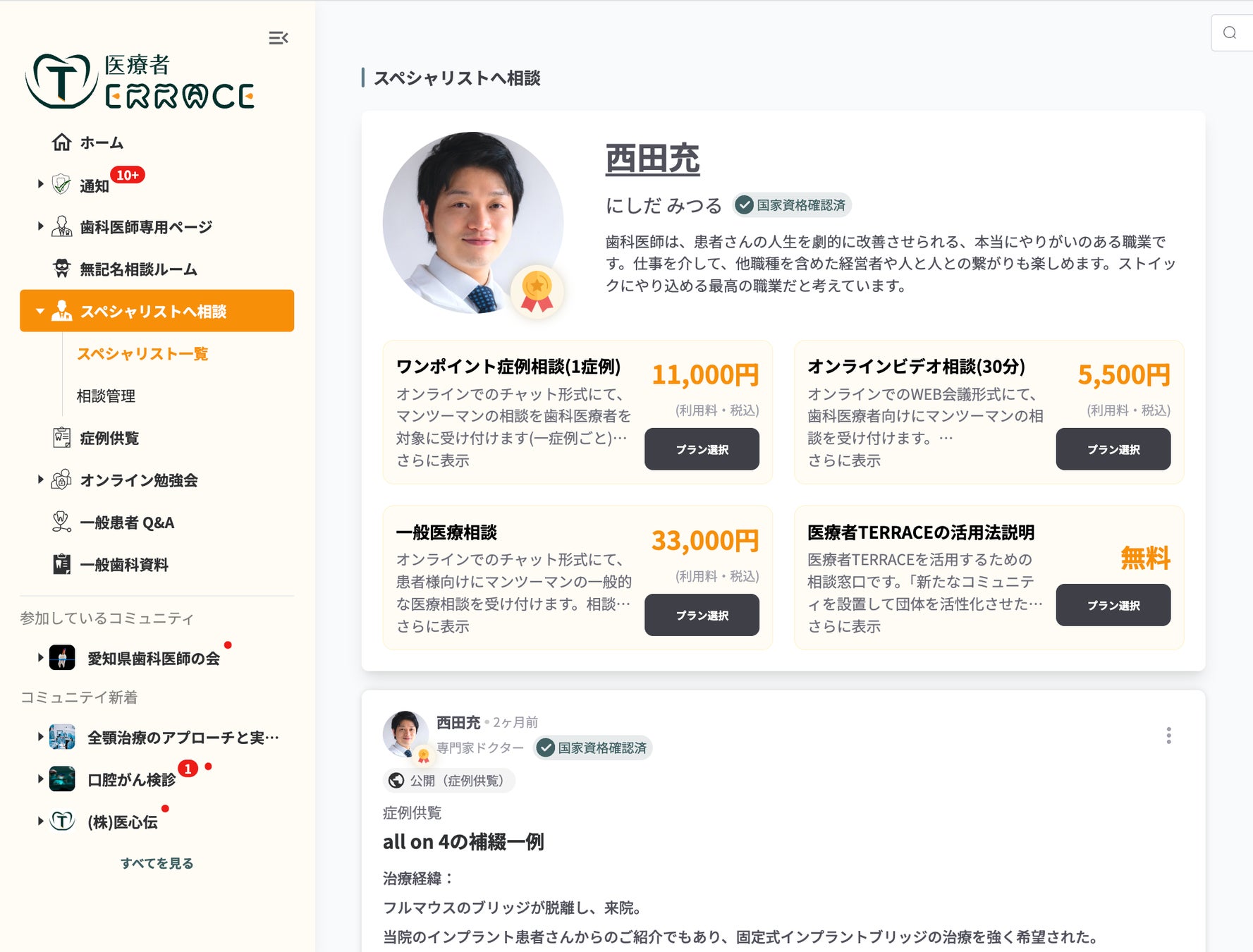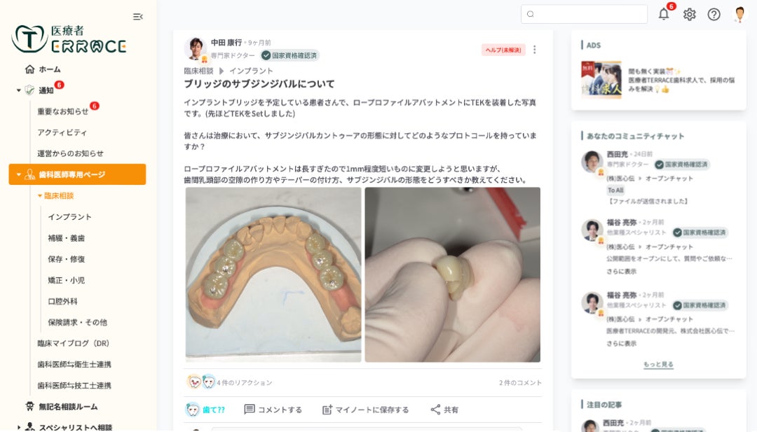 国家資格の確認を終えた歯科医師は、全国の歯科医師が集う専用ページ内で臨床相談を無料で実施出来ます。歯科医師・歯科衛生士・歯科技工士は、資格に応じた専用ページに参加でき、職種間の連携スレッドや臨床マイブログという記事を閲覧することが出来ます。