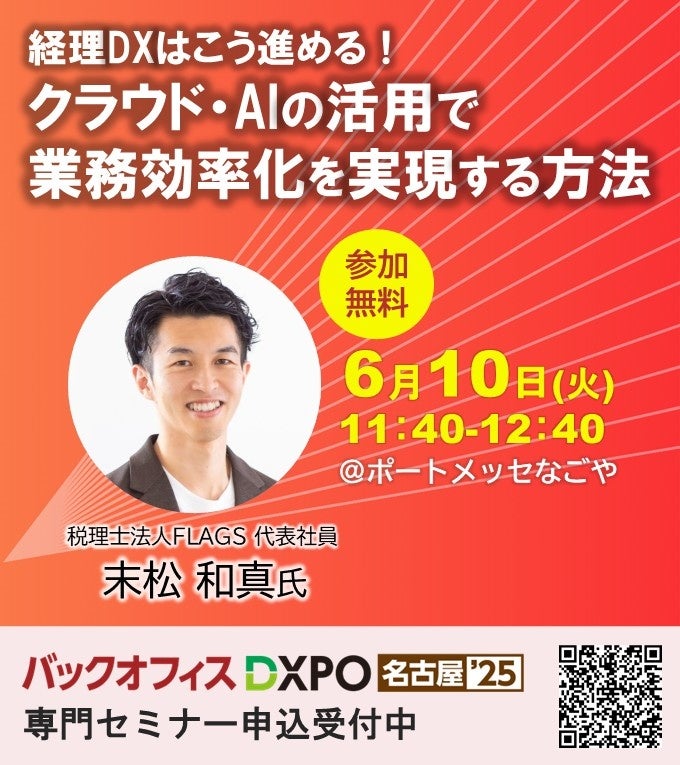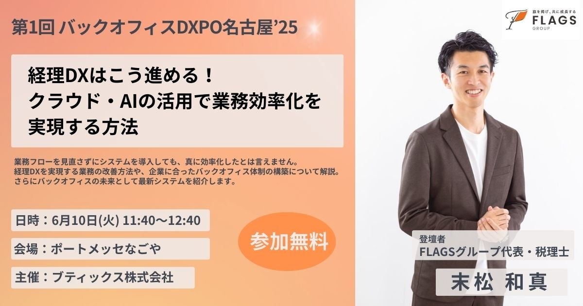 経理DXを推進するFLAGSグループ中核の税理士法人FLAGS(名古屋市東区、代表社員:末松 和真、税理士登録番号:130189)は、2025年6月10日(火)・11日(水)、ブティックス株式会社が主催する「第1回 バックオフィスDXPO(ディーエクスポ)名古屋’25」の専門セミナー(経理・財務コース)に登壇いたします。