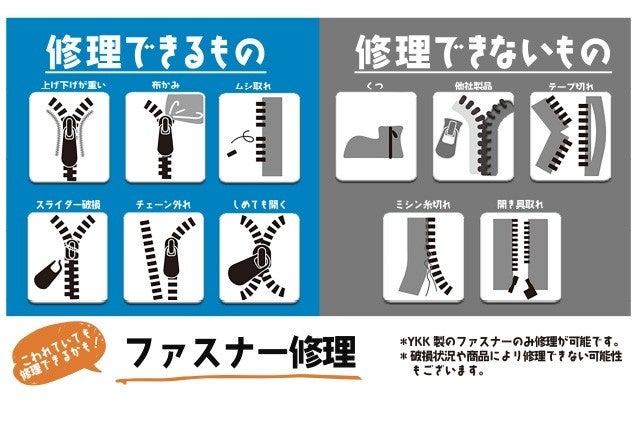 YKK製ファスナーを対象に、事前予約制で無料のリペアサービスを実施します。破損状況により対応できない場合がありますが、専門スタッフが簡単な修理をサポートします。