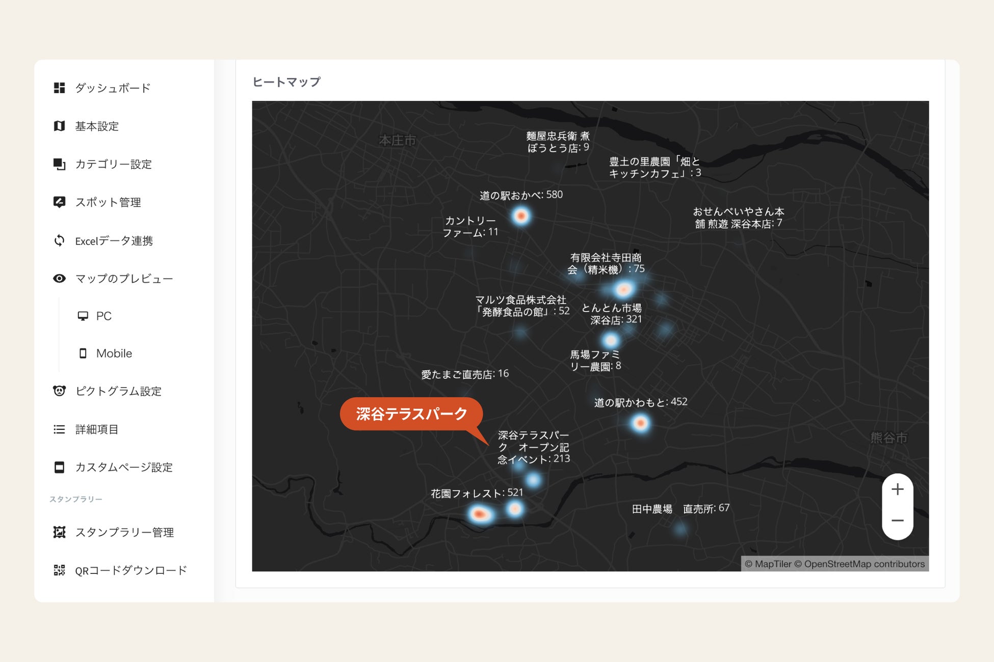 スタンプラリー企画では、100を超える市内事業者と連携しながら市内200か所以上のスポットを含む回遊促進イベントを実施しました。回遊の実態をリアルタイムに把握するために、各スポットに設置したQRコードからトラフィックを行えるよう、ヒートマップと連携した設定を行うことで、回遊後の課題などの明確化・具体化を図りました。