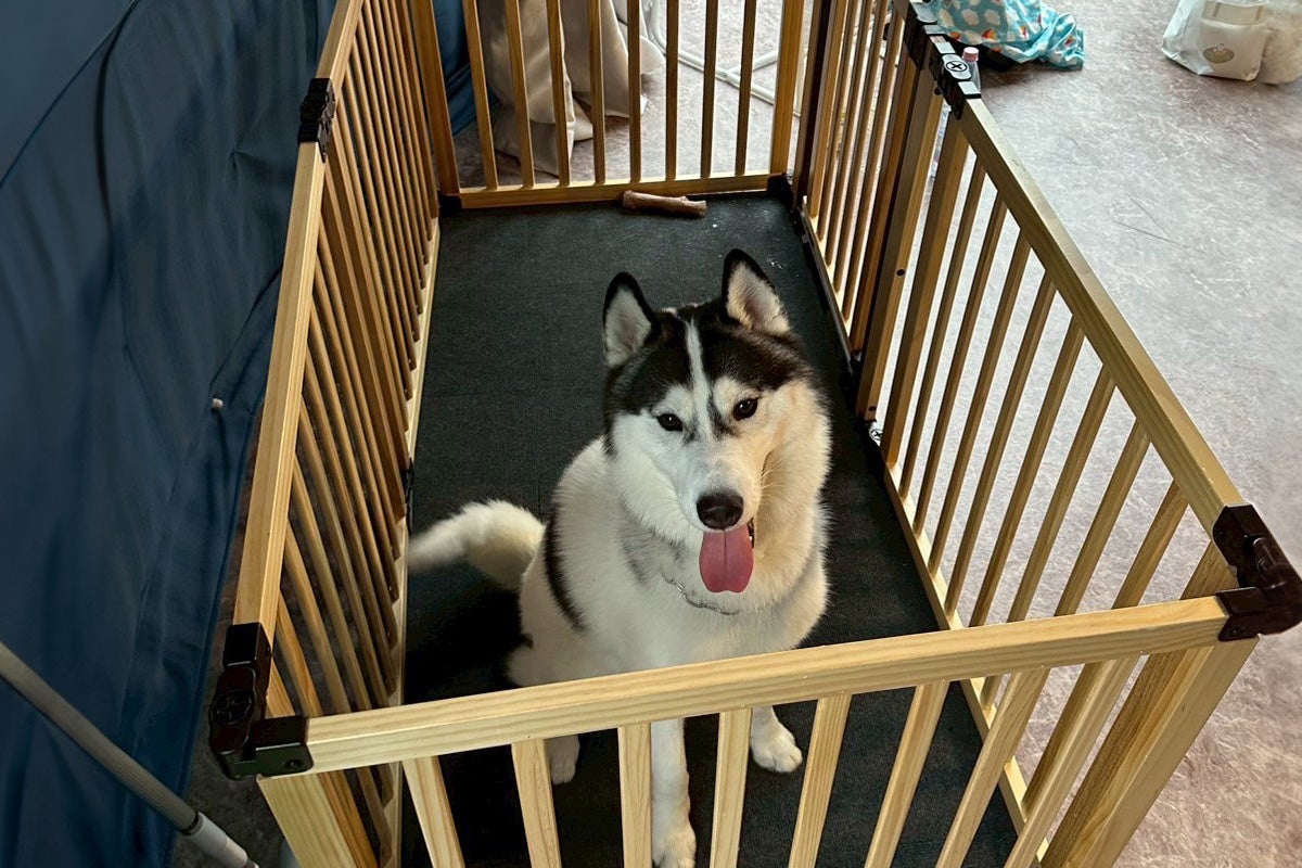 広いウッドデッキ+目の細かい追加柵を設置し、小型犬も安心して滞在可能。 テント内にはペットケージも完備 |