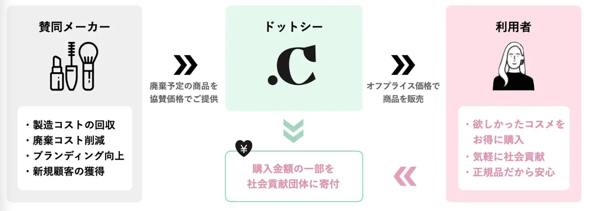 協賛企業(化粧品メーカー)は廃棄の削減につながり、利用者はお得に商品を購入できるだけでなく購入金額の一部が寄付されることで社会貢献につながります。