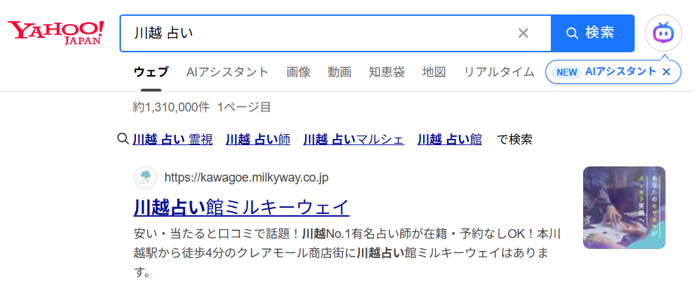 実績の一例をあげると2023年10月にオープンした川越占い館ミルキーウェイですが、「川越 占い」と検索したときに2026年2月2日現在、Google検索・Yahoo!検索ともにオーガニック検索で1位を獲得しています。