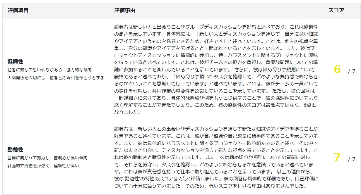 AIとの面接後、評価レポートを自動で作成する機能もお試しできるようになりました。面接の結果は、「協調性」や「勤勉性」といった評価項目ごとに点数化し、レーダーチャートで表示されます。さらに、評価項目ごとに評価の理由も併せてレポートします。