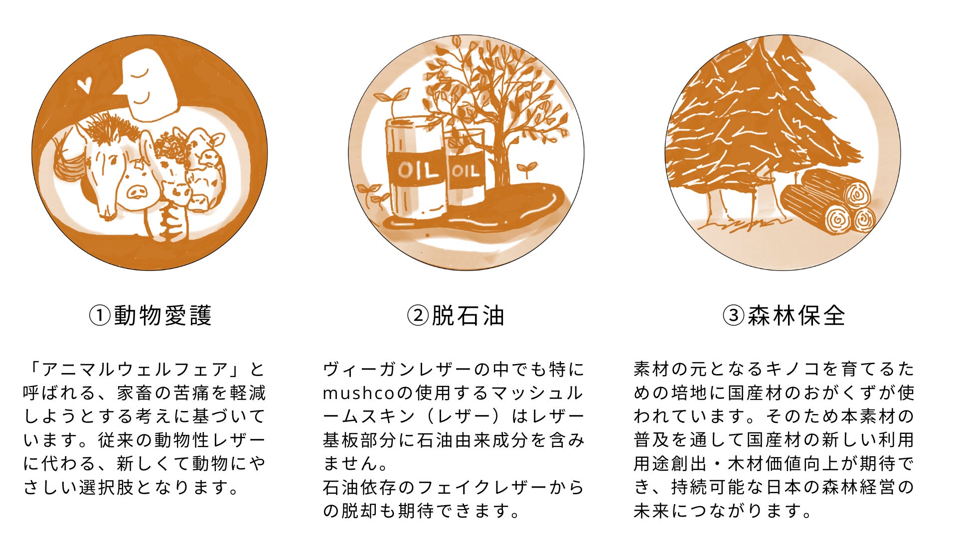 また、マッシュルームスキンは素材の基盤部分に石油を含まず製造可能で、化学物質の使用を最小限に抑えることができます。動物性の天然皮革や石油由来の合成皮革に比べ製造過程での環境負荷が非常に低く、動物愛護や地球環境を考慮した素材としてファッション業界やインテリア業界などで昨今注目されています。本素材の普及を後押しする時流としては、①動物愛護(アニマルウェルフェア)、②脱石油、③国内森林保全への貢献などが挙げられます。