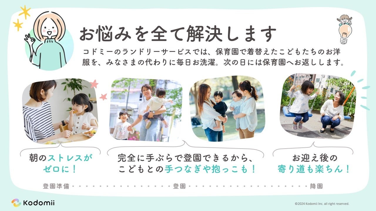 「コドミーランドリー」は、園児保護者が毎日行う子どもたちの衣類や週末のお昼寝用シーツの洗濯を代行し、送り迎えを「手ぶら」にすることで保護者の育児負担を軽減します。さらに、保育園内で発生する洗濯物も同時にお引き受けすることで、保育士の皆様の労働環境を改善するサービスです。このサービスにより、保護者と保育士がより多くの時間を本来の育児や教育に集中できるよう支援し、子育ての喜びをさらに深めるとともに、子どもたちとの貴重な時間を増やすお手伝いをいたします。