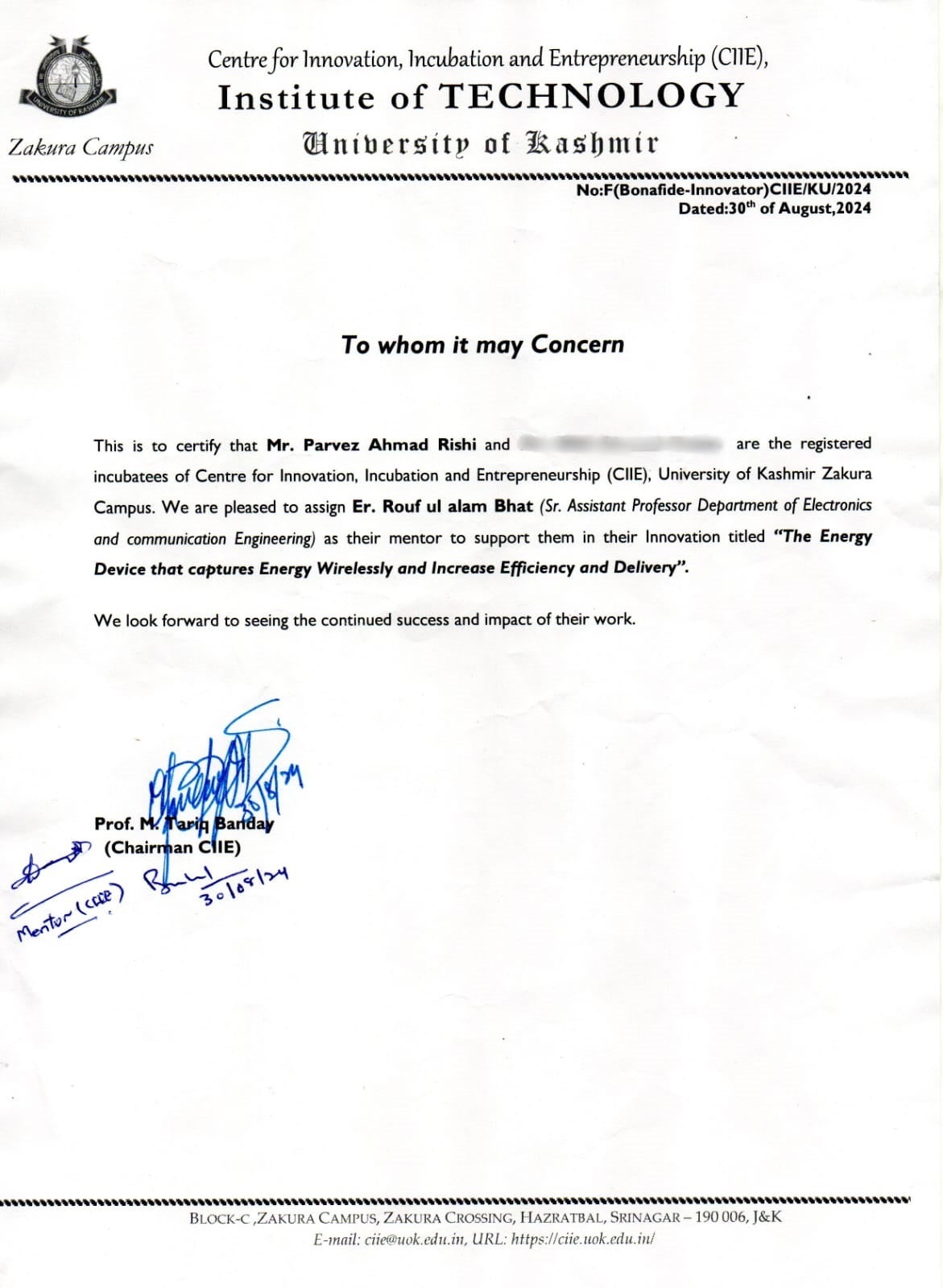 同社は、イノベーション・インキュベーション・アントレプレナーシッププログラムの一環として、カシミール大学と共同で特許を出願しています。