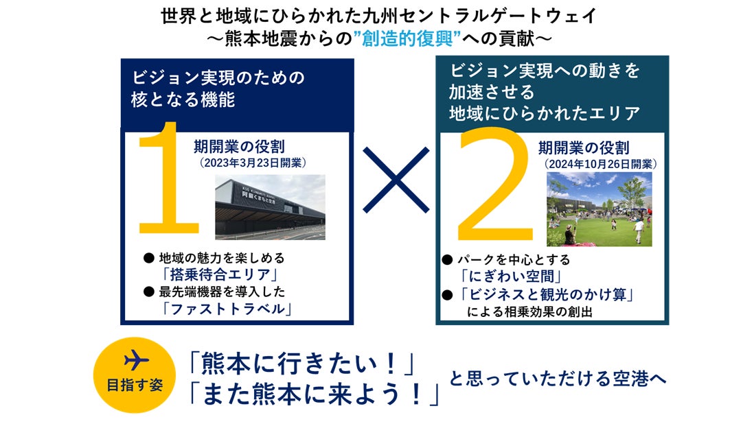 当社は、熊本地震をきっかけに導入されたコンセッション方式で事業者に選定され、「世界と地域にひらかれた九州セントラルゲートウェイ」 を掲げて空港運営プロジェクトを推進しております。2023年3月に供用を開始した旅客ターミナルビルに続く2期エリア「そらよかエリア」の開業で、ビジョン実現への動きをさらに加速させてまいります。