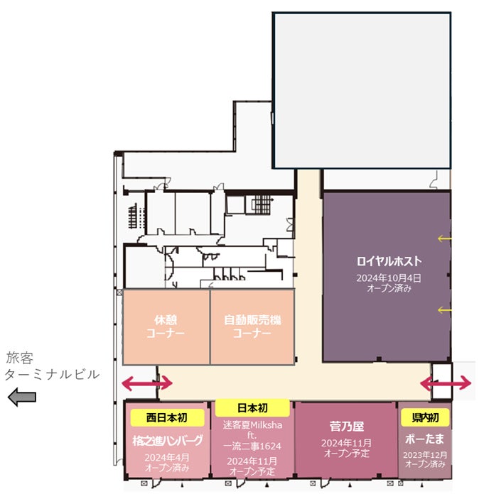 「そらよかダイニング」には、先行してオープンした「ポーたま」「格之進ハンバーグ」「ロイヤルホスト」に続き、11月にかけて「菅乃屋」「迷客夏Milksha ft. 一流二事1624」が開業し、飲食店が充実します。お急ぎでテイクアウトをご希望の方や家族でゆっくりと食事をしたい方などがそれぞれのニーズに合った店舗を選び、お楽しみいただけるラインナップです。