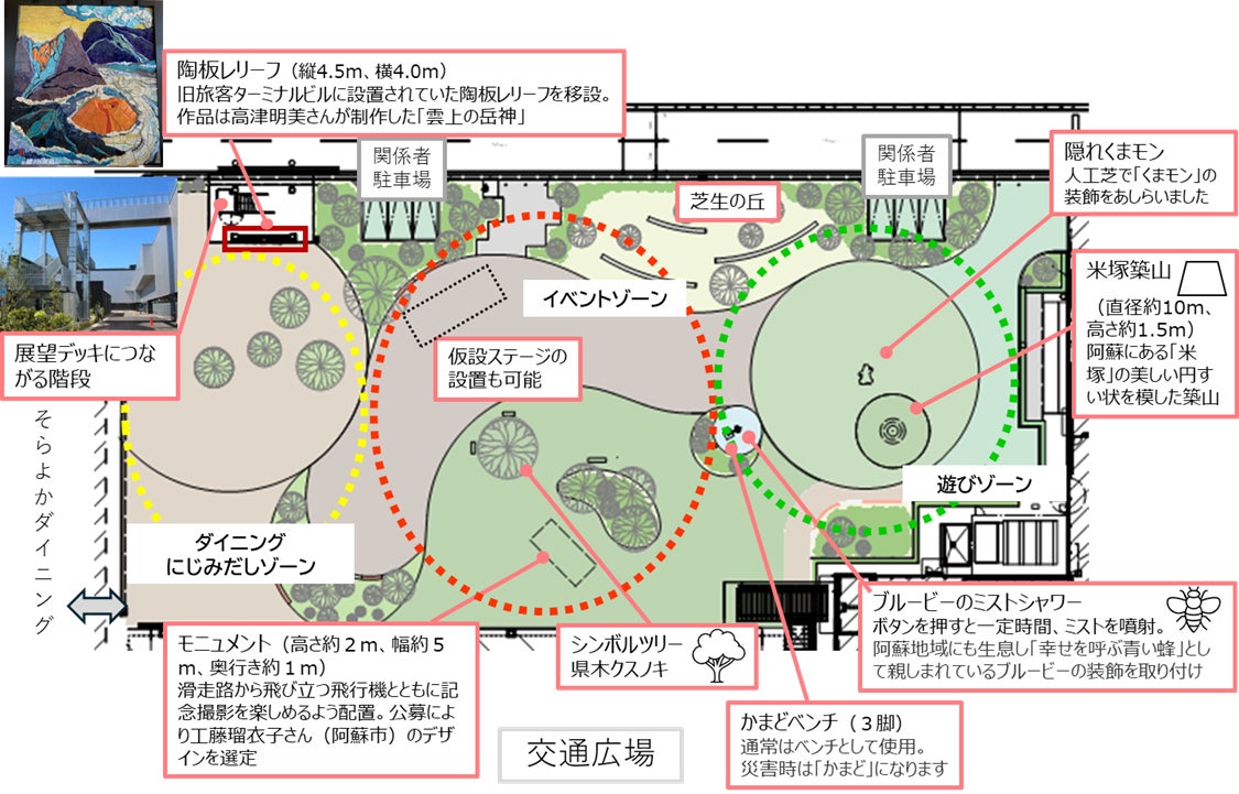 「そらよかパーク」には、西側から「ダイニングにじみだしゾーン」「イベントゾーン」「遊びゾーン」という大きく3区分のゾーンを設けています。「ダイニングにじみだしゾーン」は隣接する「そらよかダイニング」との連動を意識したエリアで、飲食店でテイクアウトした商品などをお楽しみいただけます。「イベントゾーン」では催しの実施を想定し、仮設のステージやテントなどを組むことも可能。「遊びゾーン」には、国の名勝・天然記念物として親しまれている「米塚」(阿蘇市)をモチーフにした築山や、阿蘇地域に生息する「ブルービー」の装飾をあしらったミストシャワーがあり、子どもたちの遊び場となります。