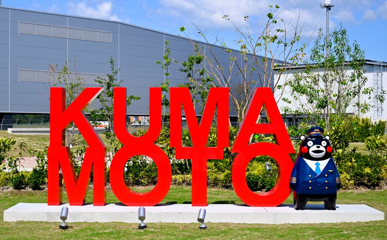 「KUMAMOTO」の文字を熊本県のイメージカラーである赤色でシンプルに仕上げ、国内外で大人気の「くまモン」がパイロットの衣装を着て並んでいます。設置にあたってはフォトスポットとして、離陸した飛行機を画角に収められる場所にこだわりました。阿蘇くまもと空港のシンボルとして、末永く皆さまに親しんでいただきたい記念碑です。