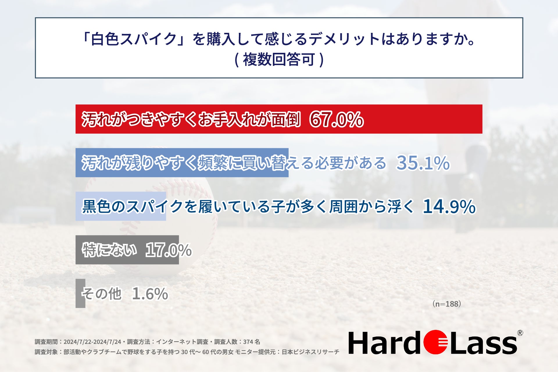 次に「白色スパイクを購入したことがある」と回答した方に、「白色スパイクを購入して感じるデメリットはあるか」を問う設問の回答では、1位が「汚れがつきやすくお手入れが面倒」で67.0%、2位が「汚れが残りやすく頻繁に買い替える必要がある」で35.1%という結果になりました。この結果から、やはり事前の懸念の通り、白色スパイクを使用する上では、汚れがつきやすいことによるお手入れの手間や、汚れが残ることに伴う買い替えの頻度にデメリットを感じている方が多いという事実が判明しました。