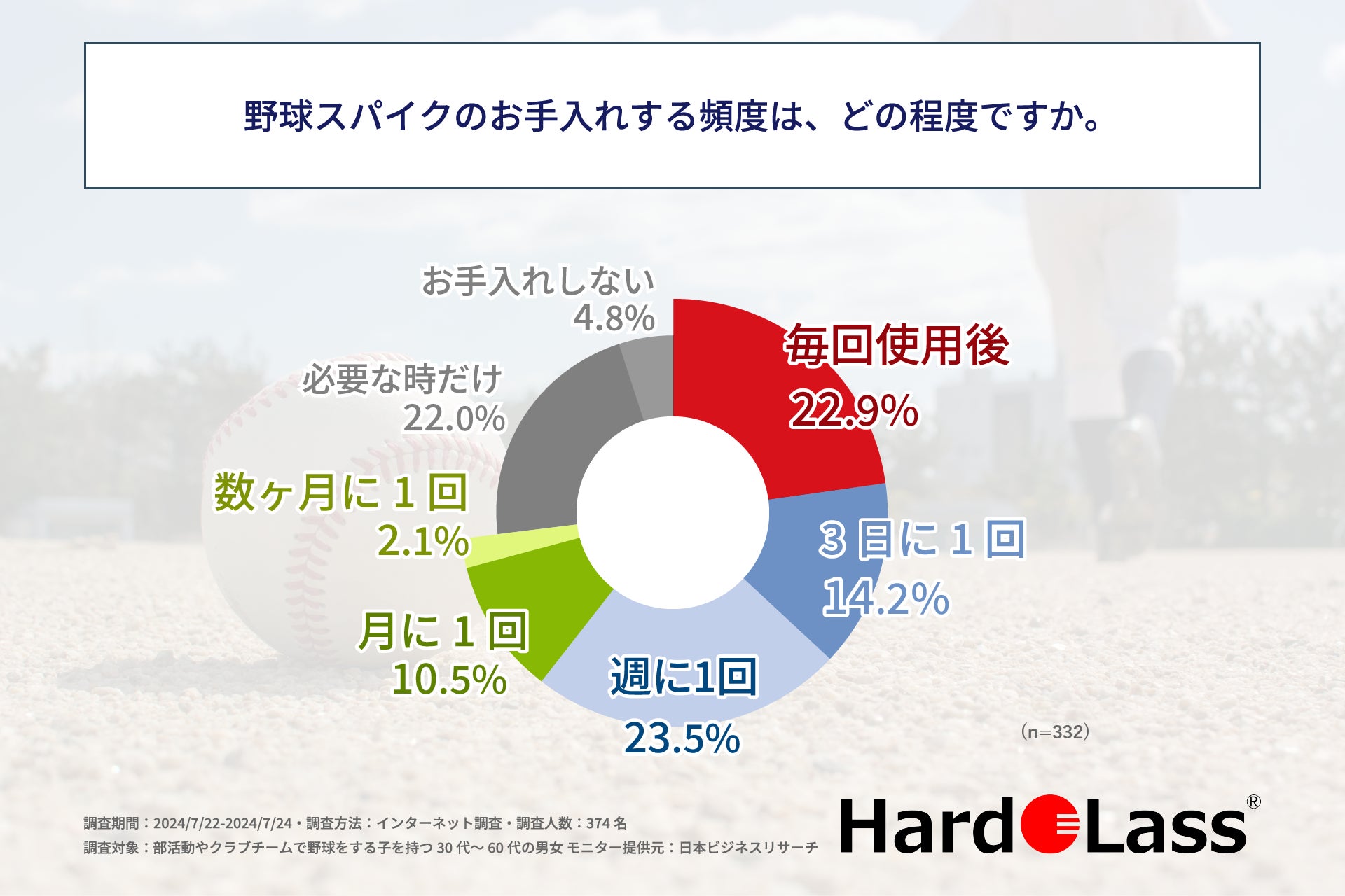 また、「野球スパイクをお手入れする頻度はどれくらいか」を尋ねる設問の回答では1位が「週に1回」で23.5%、次いで多かった2位が「毎回使用後」で22.9%となりました。そして、3位「必要な時だけ(22.0%)」、4位「3日に1回(14.2%)」と続き、6割の方が最低でも週に1回以上は野球スパイクのお手入れをしていることがわかりました。