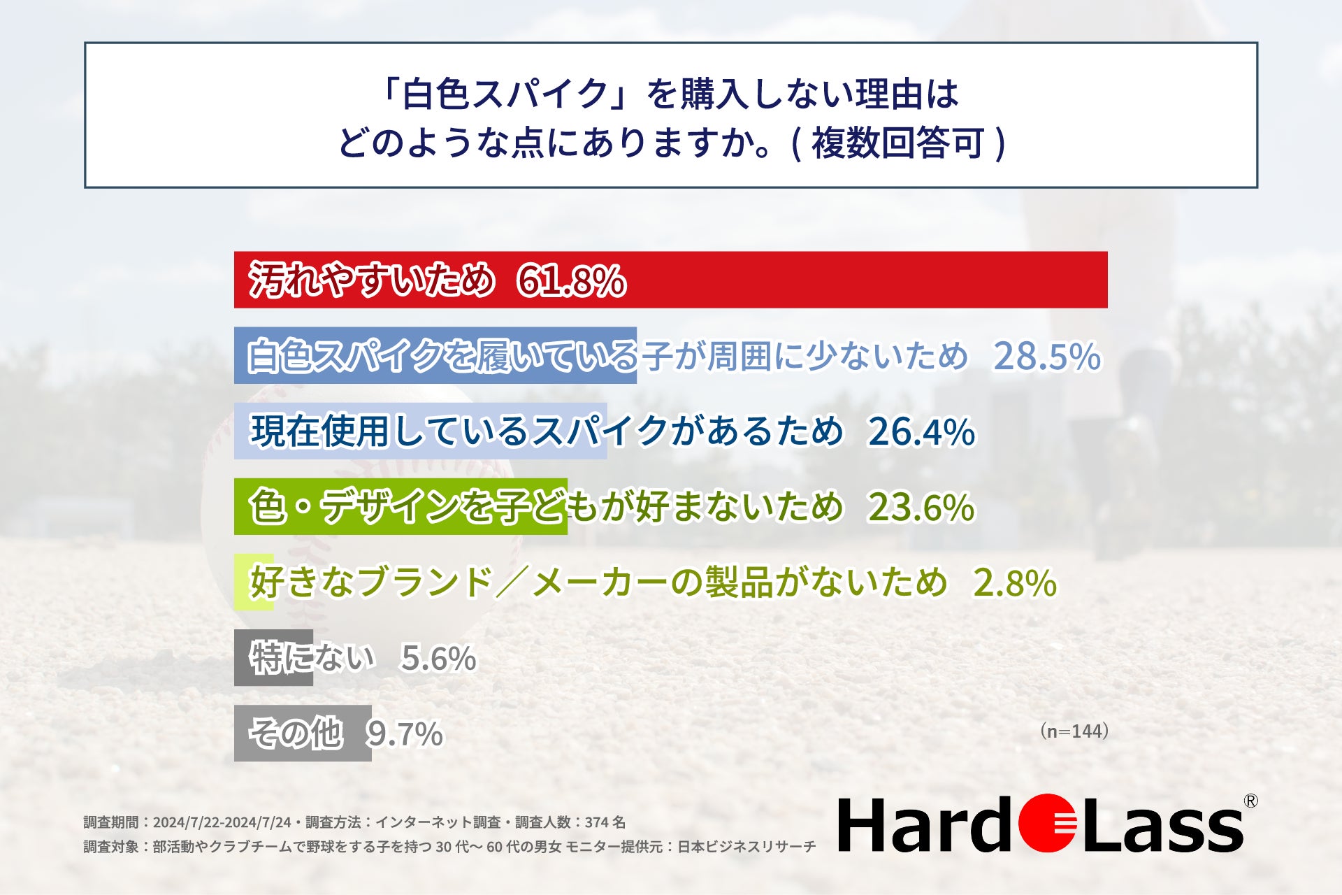 最後に「白色スパイクを購入したことがない」と回答した方に、「白色スパイクを購入しない理由はどのような点にあるか」を問う設問の回答では、圧倒的1位が「汚れやすいため」で61.8%という結果になりました。また、2位は「白色スパイクを履いている子が周囲に少ないため」で28.5%、3位が「現在使用しているスパイクがあるため」で26.4%と続き、白色スパイクを選ばない主な理由としては、「汚れやすさ」が顕著であるとわかりました。