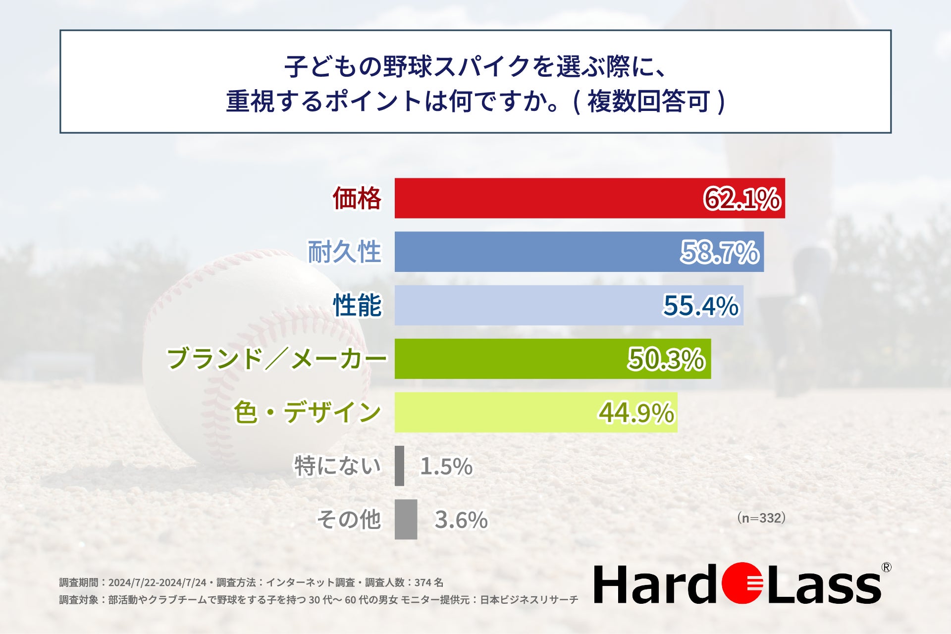 子どもの野球のスパイク選びで重視する点の1位は「価格」、2位は「耐久性」