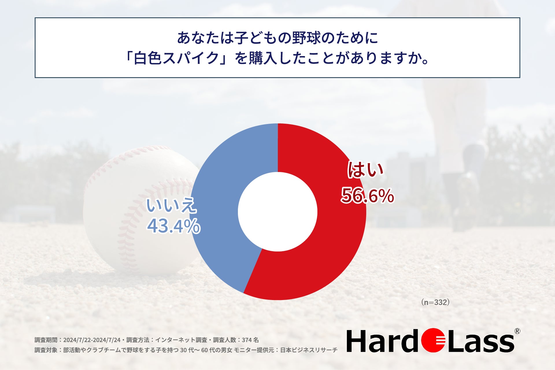 また、「子どもの野球のため『白色スパイク』を購入したことがあるか」を尋ねる設問の回答では、「はい」が56.6%で、「いいえ」の43.4%を上回る形になりました。この結果から、野球をする子を持つ親の過半数が「白色スパイク」を購入した経験があるとわかりました。