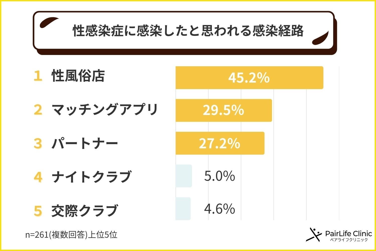 ご来院いただいた患者様の男女261人に「感染の疑いが考えられる感染経路はどこですか?(複数回答可)」とアンケート調査したところ、「性風俗店」(45.2%)「マッチングアプリ」(29.5%)「パートナー」(27.2%)「ナイトクラブ」(5.0%)「交際クラブ」(4.6%)という結果となりました。
