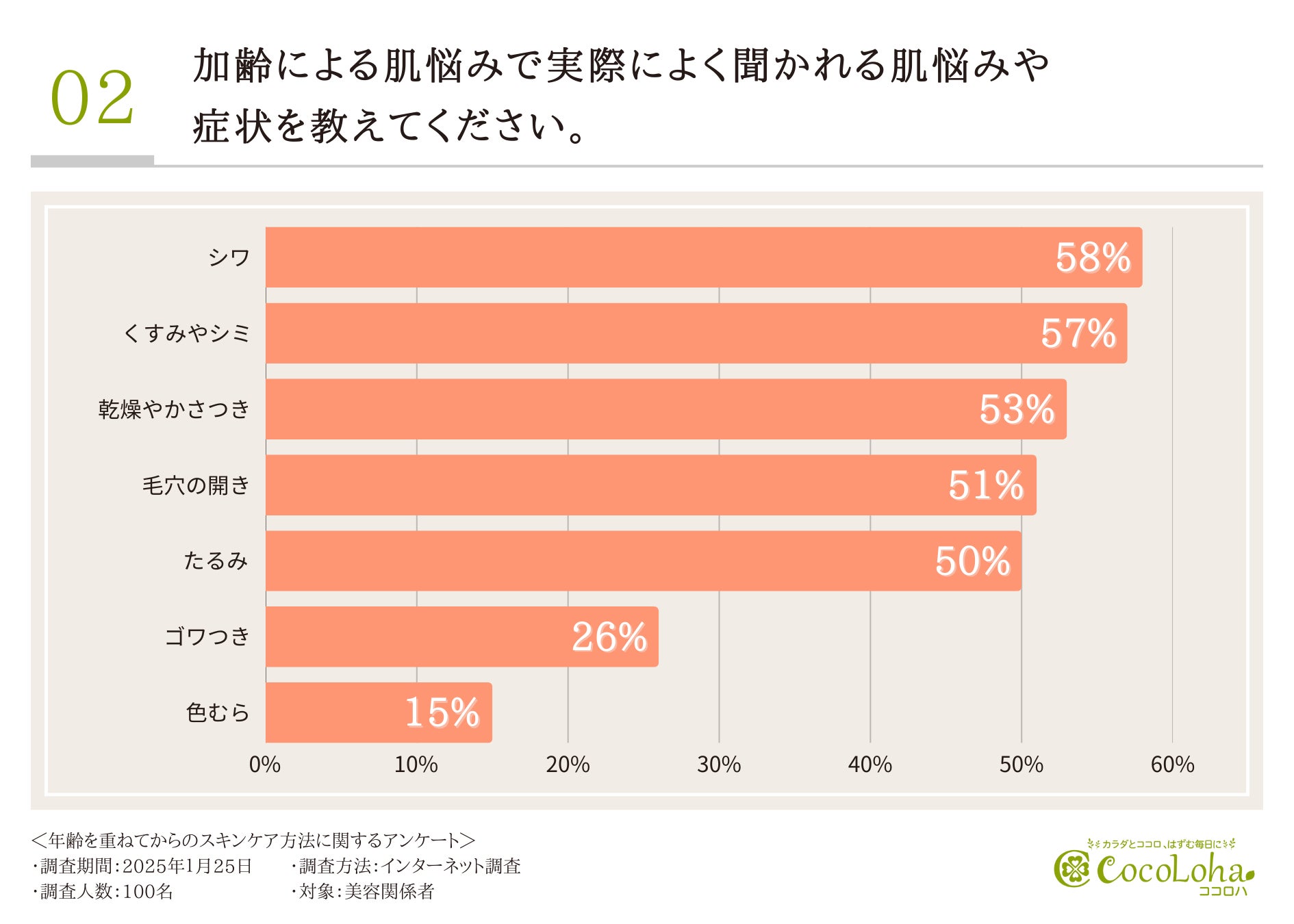 次に、加齢による肌悩みで実際によく聞かれる肌悩みや症状について伺ったところ、「シワ(58.0%)」「くすみやシミ(57.0%)」「乾燥やかさつき(53.0%)」という回答が集まりました。