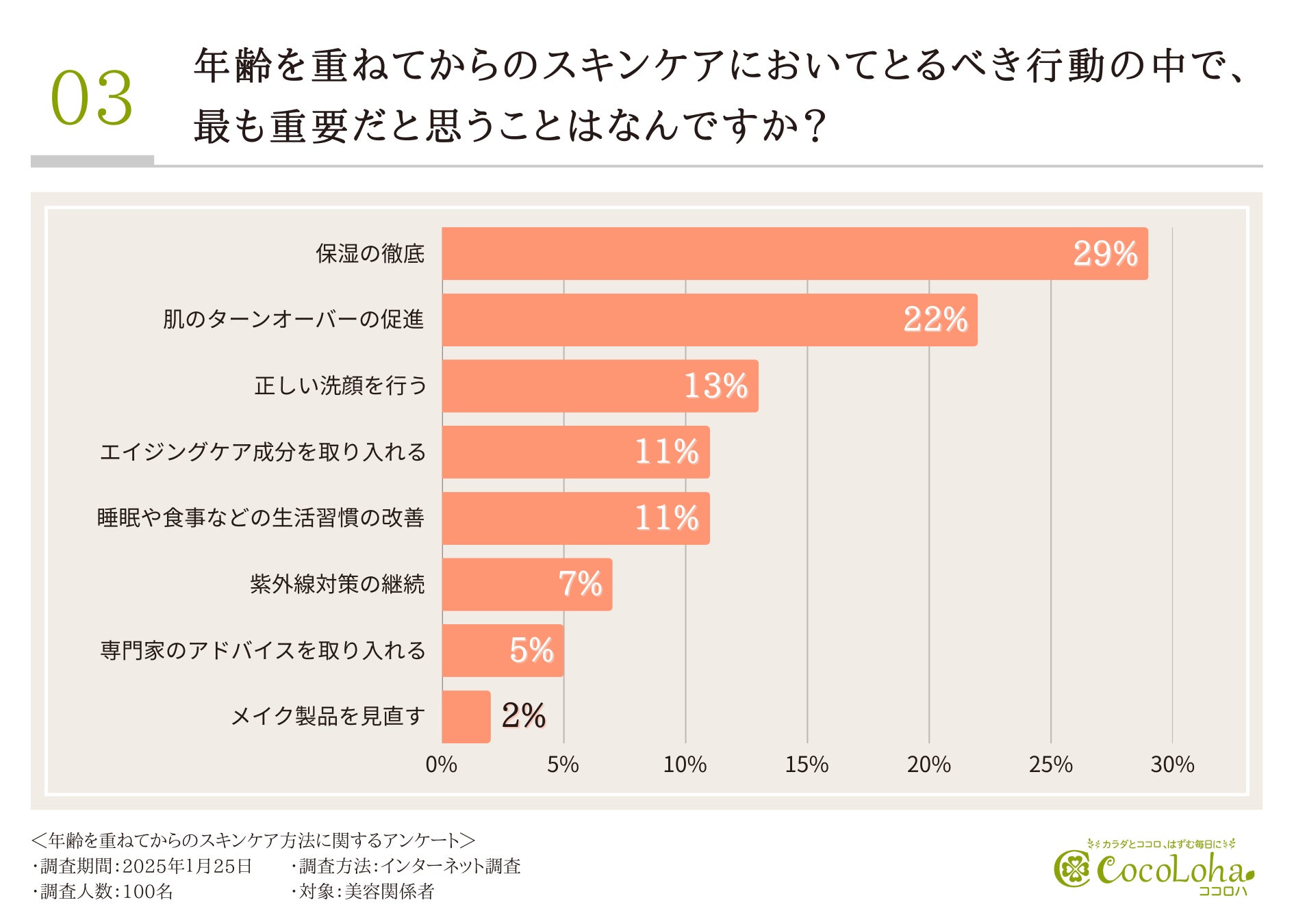 そこで、年齢を重ねてからのスキンケアにおいてとるべき行動の中で、最も重要だと思うことについて伺ったところ、「保湿の徹底(29.0%)」「肌のターンオーバーの促進(22.0%)」「正しい洗顔を行う(13.0%)」という回答が集まりました。