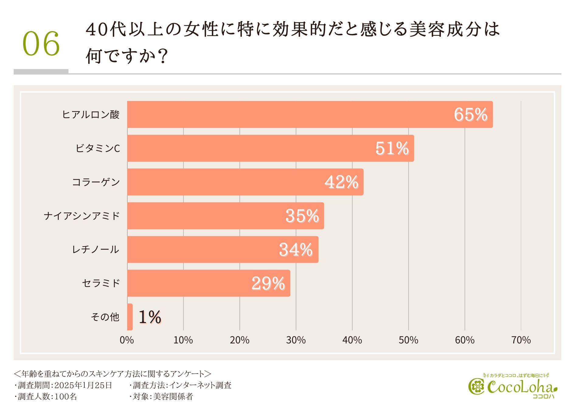 40代以上の女性に特に効果的だと感じる美容成分について伺ってみたところ、「ヒアルロン酸(65.0%)」「ビタミンC(51.0%)」「コラーゲン(42.0%)」「ナイアシンアミド(35.0%)」という回答が集まりました。